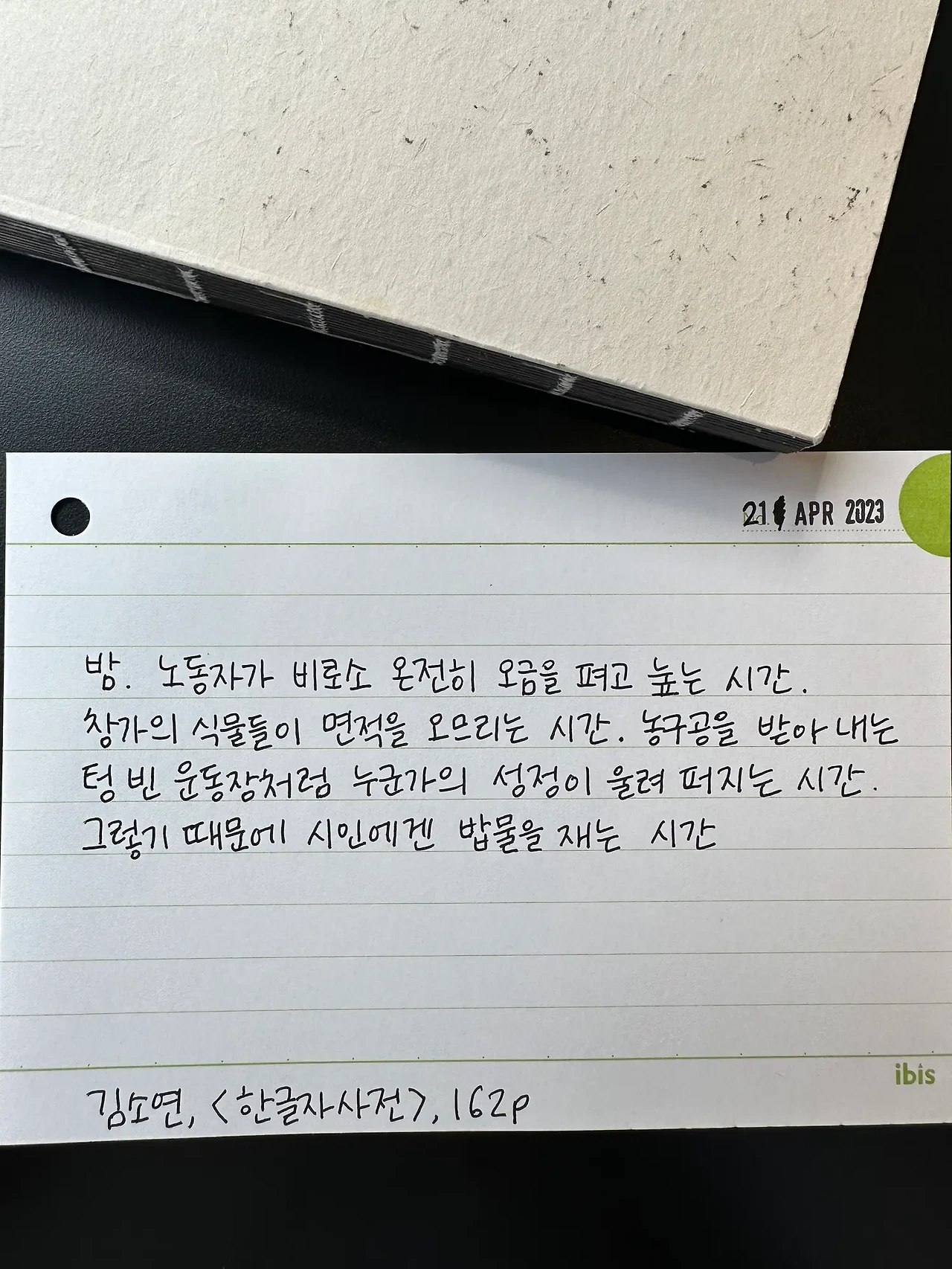 밤. 노동자가 비로소 온전히 오금을 펴고 눕는 시간. 창가의 식물들이 면적을 오므리는 시간. 농구공을 받아내는 텅 빈 운동장처럼 누군가의 성정이 울려 퍼지는 시간. 그렇기 때문에 시인에겐 밥물을 재는 시간.