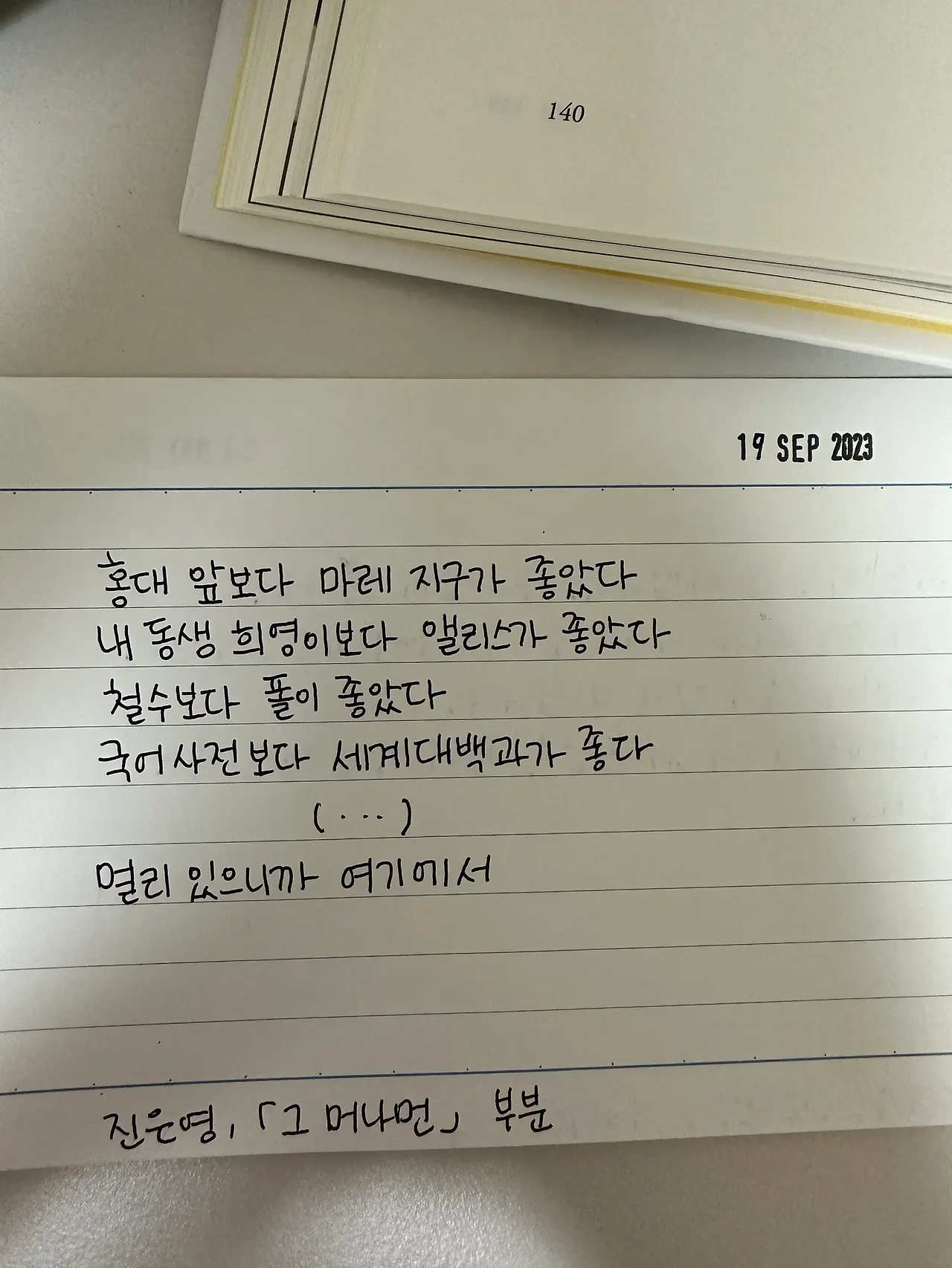 이 시를 읽으며 여기에서 멀리 있는 세계만 좋아했던 시간들이 떠올라 잠깐 책상에 앉아 멍하게 옛날 생각을 했다.