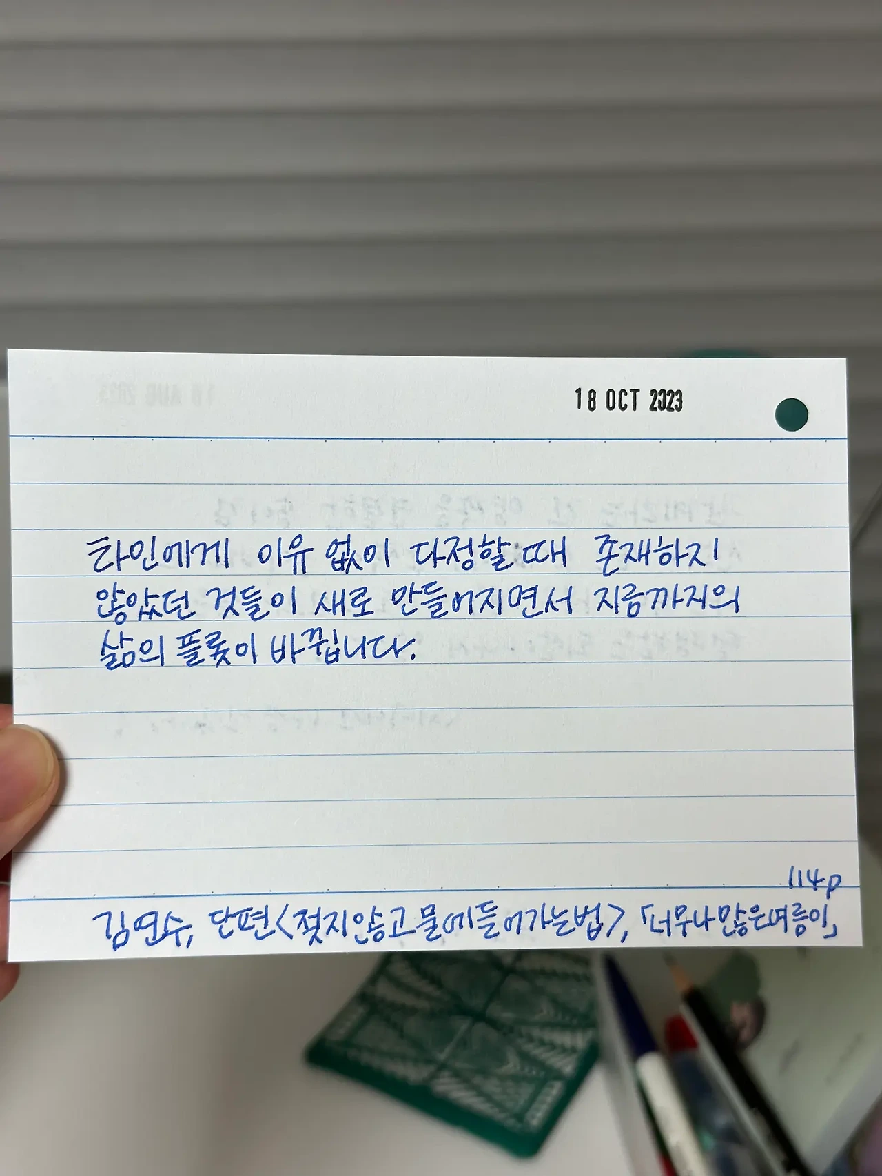 타인에게 이유없이 다정할 때 플롯이 바뀐 경험이 있다. 그래서 더 믿을 수 있다 이 문장. 김연수 작가님도 그런 경험이 있으신가봐.