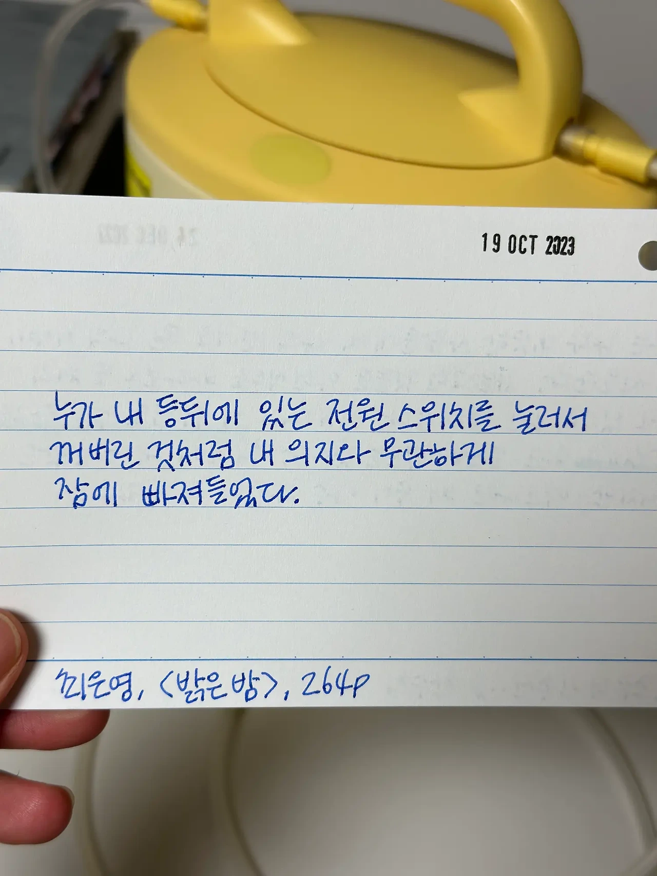 누가 내 등뒤에 있는 전원 스위치를 눌러서 꺼버린 것처럼 내 의지와 무관하게 잠에 빠져들었다.
