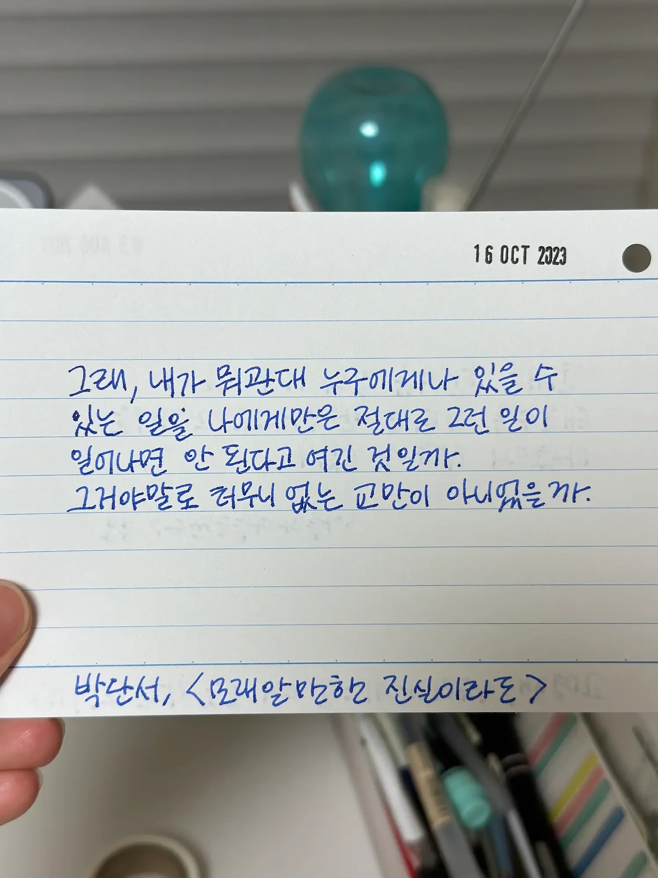 이런 교만이 하루에도 몇 번이나 내 마음속에 생기는지 이 문장을 읽다가 교만한 나를 흘겨봤다.