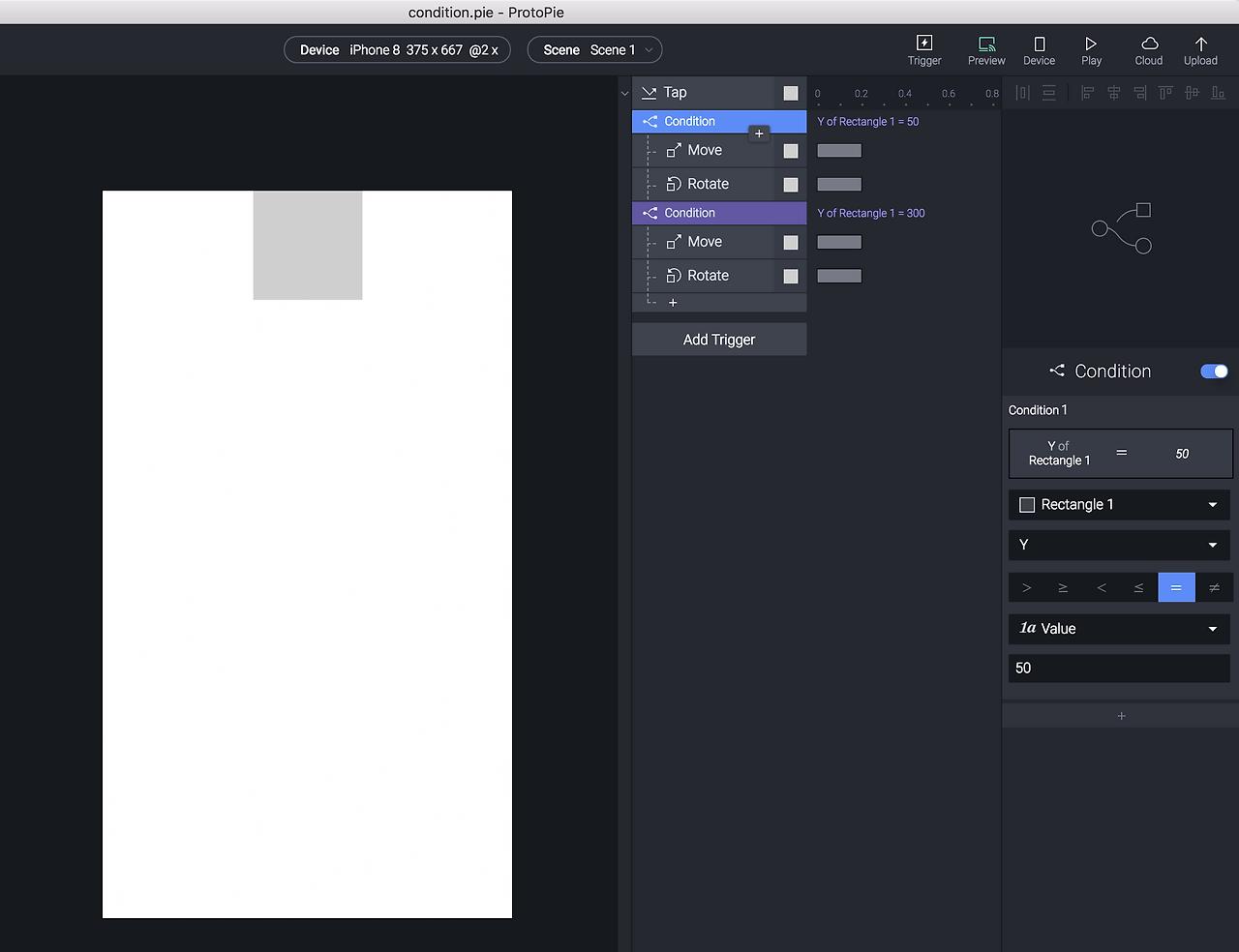 3) + 클릭 후 Condition 추가 -> 속성창에서 Y값이 50일때를 입력