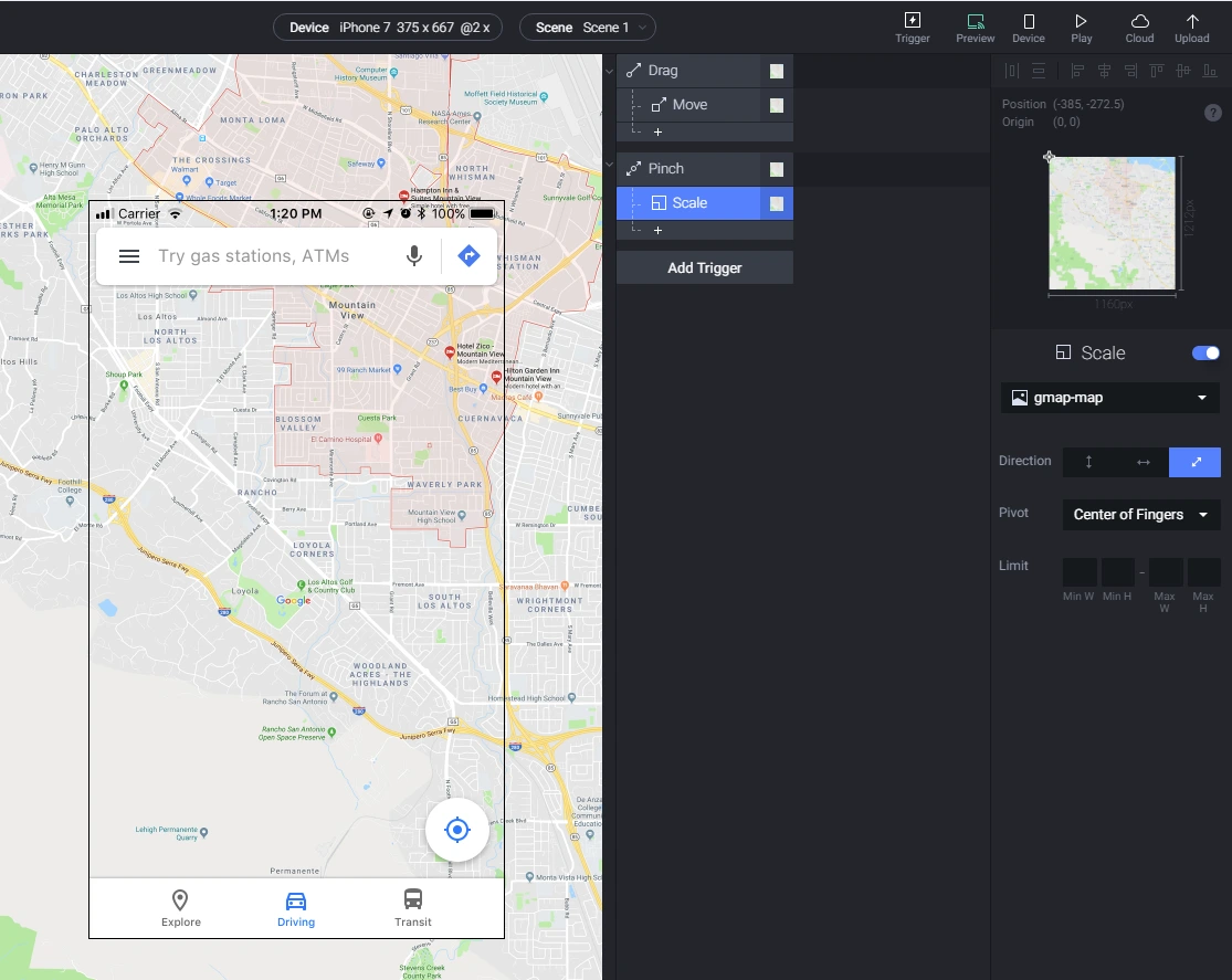 Drag는 말그대로 영역을 손가락으로 드래그 했을 때의 명령을 나타내고 Pinch는 두손가락을 이용하여 늘렸을 때를 의미합니다. 이것을 이용하여 간단한 지도 프로토타이핑이 가능합니다.