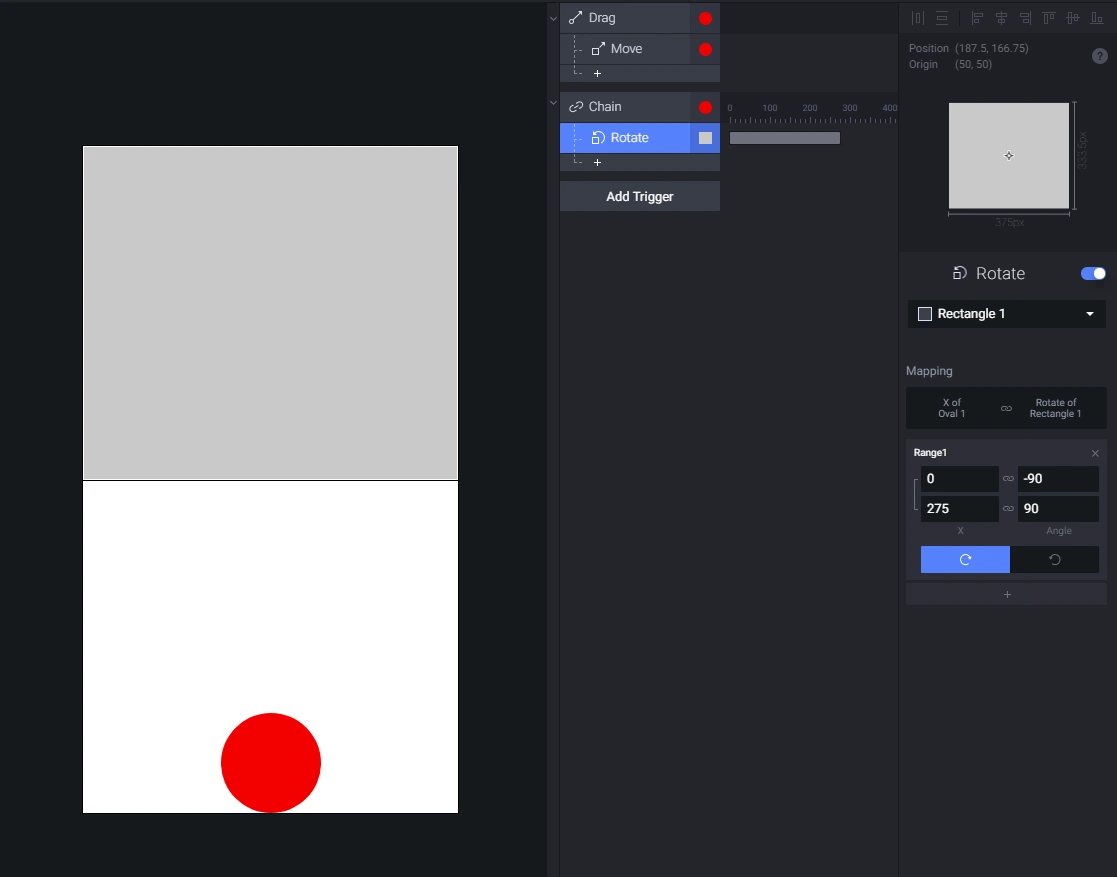 5) Rotate를 추가하여 Range(범위)값에 원의 x값이 0-275(스크린크기375-원의너비100) 변화할 동안 -90~90도 까지 Angle한다로 지정합니다.