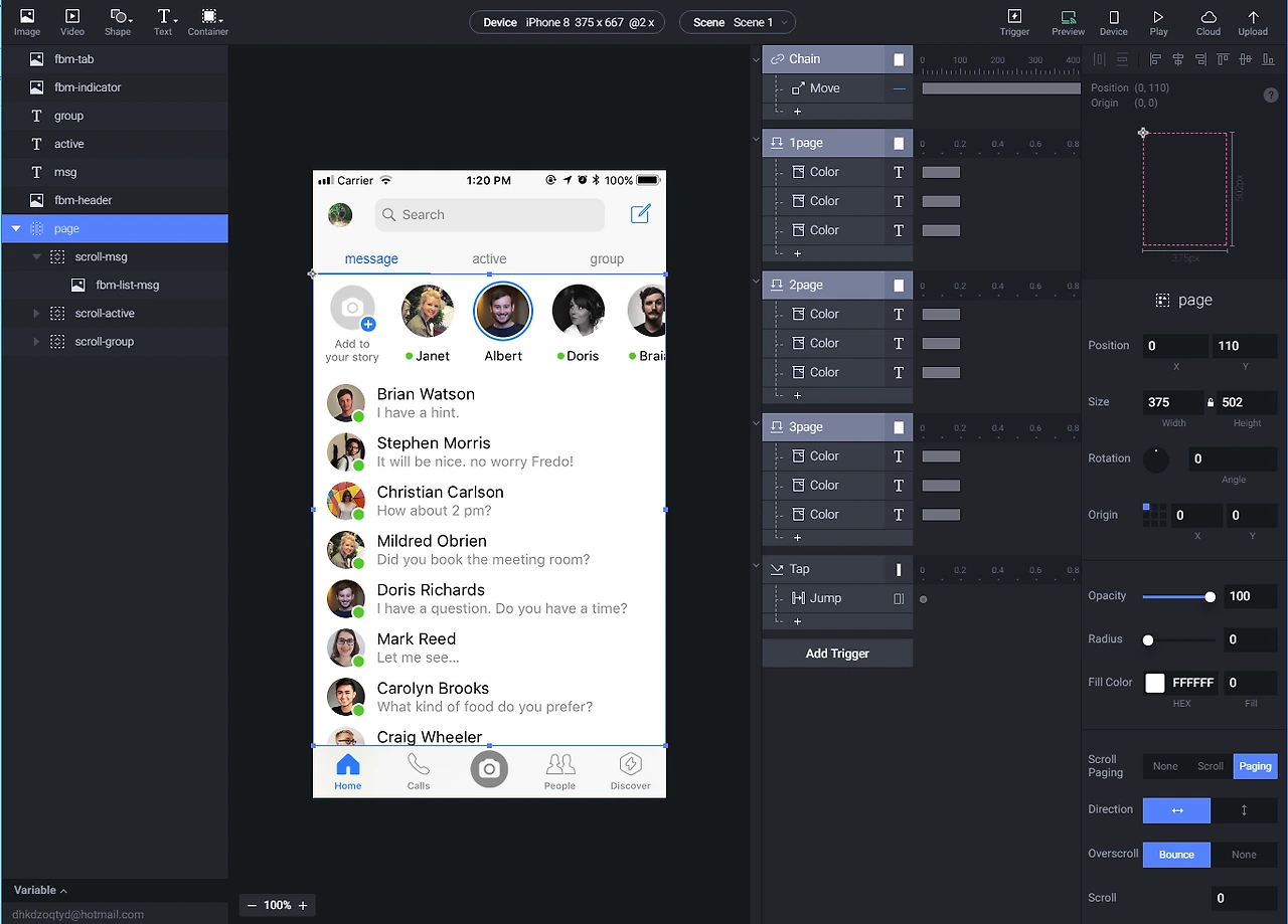 먼저 Container은 크게 scroll과 paging으로 나뉠 수 있으며 이 두개를 동시에 쓸 수 있고 초기 명칭이 Group이었던 것처럼 섹션을 나눈다는 생각으로 쓰면 됩니다. 처음 Container을 만들어 필요한 요소들을 하위에 속하게 드래그하면, Container 영역만큼 잘려져 보이게 되는데 이것은 우측 속성창에 Clip Sublayers를 체크해제하면 됩니다.