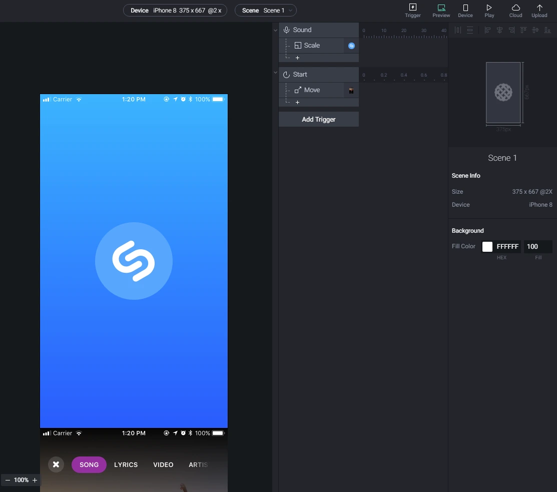 Sound는 Device에서 소리를 감지했을 때 동작하는 Trigger로 영상, 음악 등 소리를 감지한 후 동직하는 프로토타이핑을 만들 때 유리합니다. Start는 일정시간 Delay후 동작하도록 할 수 있는 Trigger로 순차 진행이 가능합니다. 그래서 이 예제에서는 무대를 떠올리면 됩니다. 소리가 들리면 logo의 크기가 변화하고 그 소리를 감지한 후 음악에 관련 된 화면이 뜬다는 느낌으로 만들어줍니다.