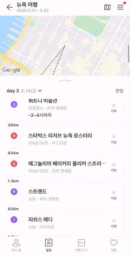 그래서 2주 동안의 빡빡한 계획에 트리플이 많은 도움이 됐다. 특히 뉴욕 여행에서의 나는 하루에 10000보는 기본일 정도로 걷고, 또 걷길 반복했던 뚜벅이였다. 그래서 트리플로 여행 계획을 짤 때 지도에 점선으로 경로를 표시해주는 기능을 유용하게 썼다.