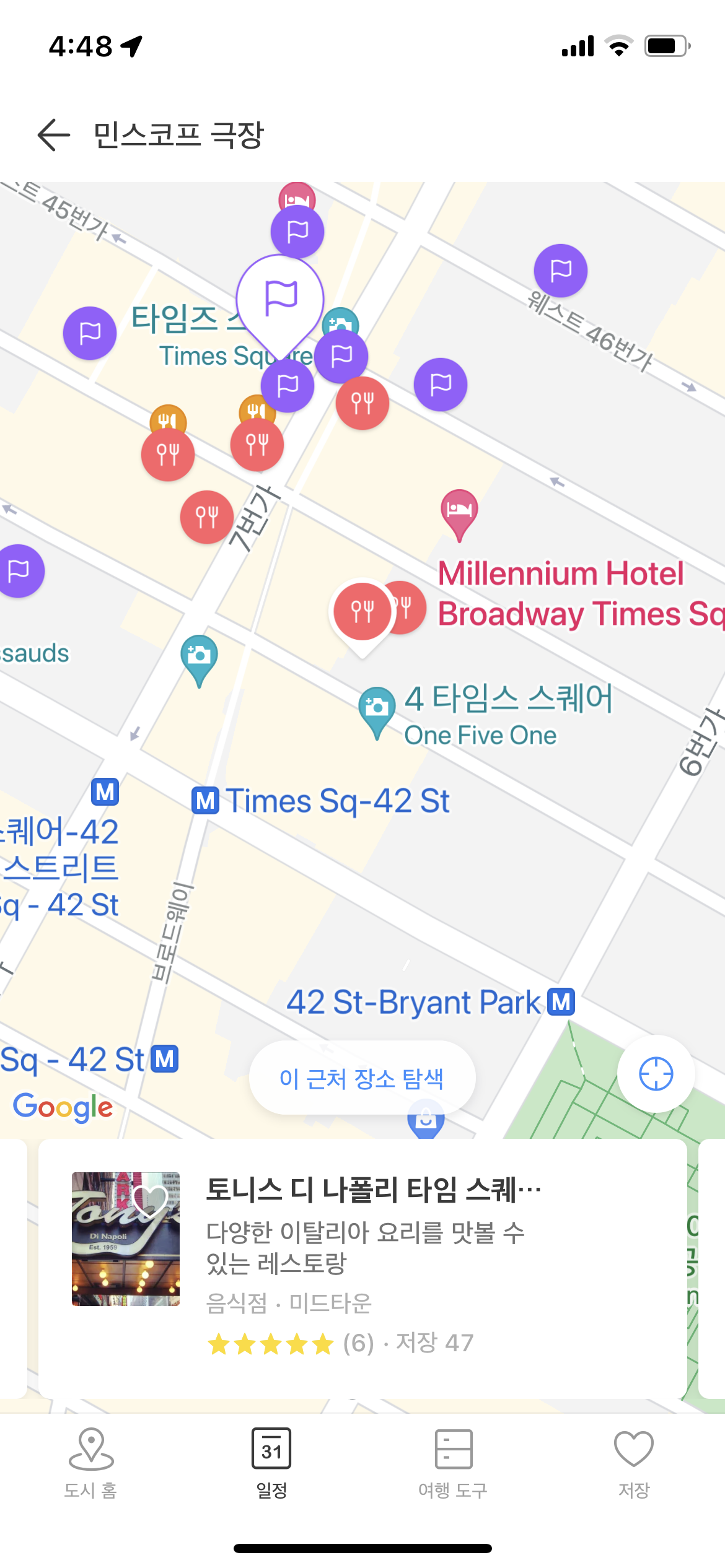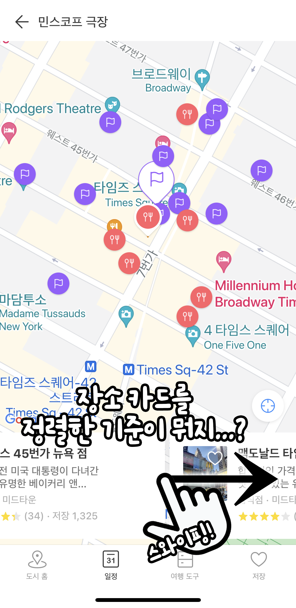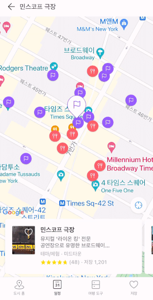 먼저, ⑤ 민스코프 극장 주변으로 맵 확대 상태에서는 하단의 카드를 스와이핑하여 이 근처의 장소를 탐색할 수 있다. 그런데 이 카드가 무슨 기준으로 나열되는 것인지 알 수 없었다. 이 근처 장소 탐색에 표시되는 장소들은 음식점(빨간색 아이콘), 그리고 관광명소(보라색 아이콘)로 구분된다. 그런데 음식점을 찾기 위해 트리플에 접속한 페르소나의 입장에서는 음식점과 관광명소가 뒤죽박죽 섞여 있어서 원하는 정보를 찾기 어려웠다. 이를 해결하기 위해서 장소를 구성할 수 있는 필터 기능이 추가되어야 한다고 생각했다.