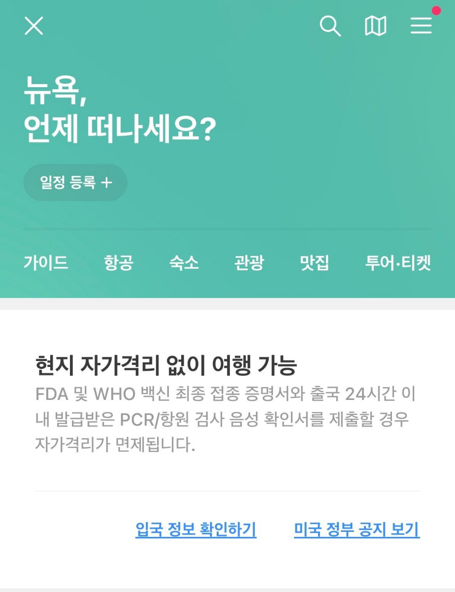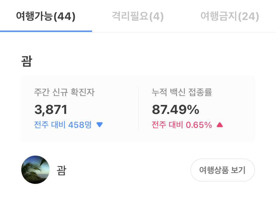해외 여행의 경우, 코로나19 상황에 맞추어 여러 가지 변화가 있었다. 여행지를 선택하면 해당 국가의 코로나19 관련 정책을 안내한다. 홈 화면에서는 코로나19와 관련한 ▲여행가능 ▲격리필요 ▲여행금지 국가를 분류하고, 각 국가별 확진자 및 백신 접종률 정보를 제공한다.