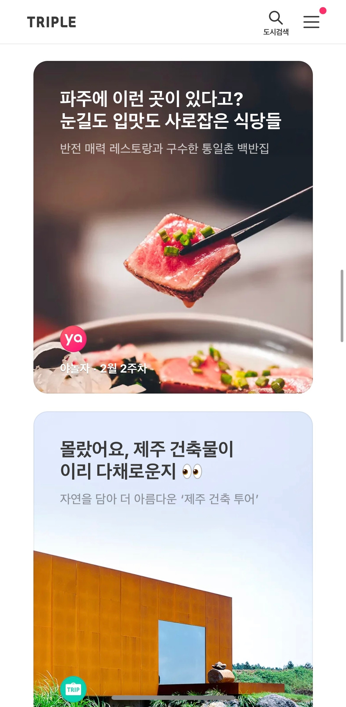 코로나19 이후 트리플을 처음 켜보았다. 나에게 트리플은 해외 여행을 다닐 때 쓰는 앱이었기 때문이다. 코로나19 이후로도 강릉, 경주, 제주 같은 곳으로 국내 여행을 갔지만, 굳이 트리플을 쓰지는 않았다. 그런데 내가 트리플을 외면(ㅠㅠ)하던 사이 트리플에는 많은 변화가 있었다고 한다.