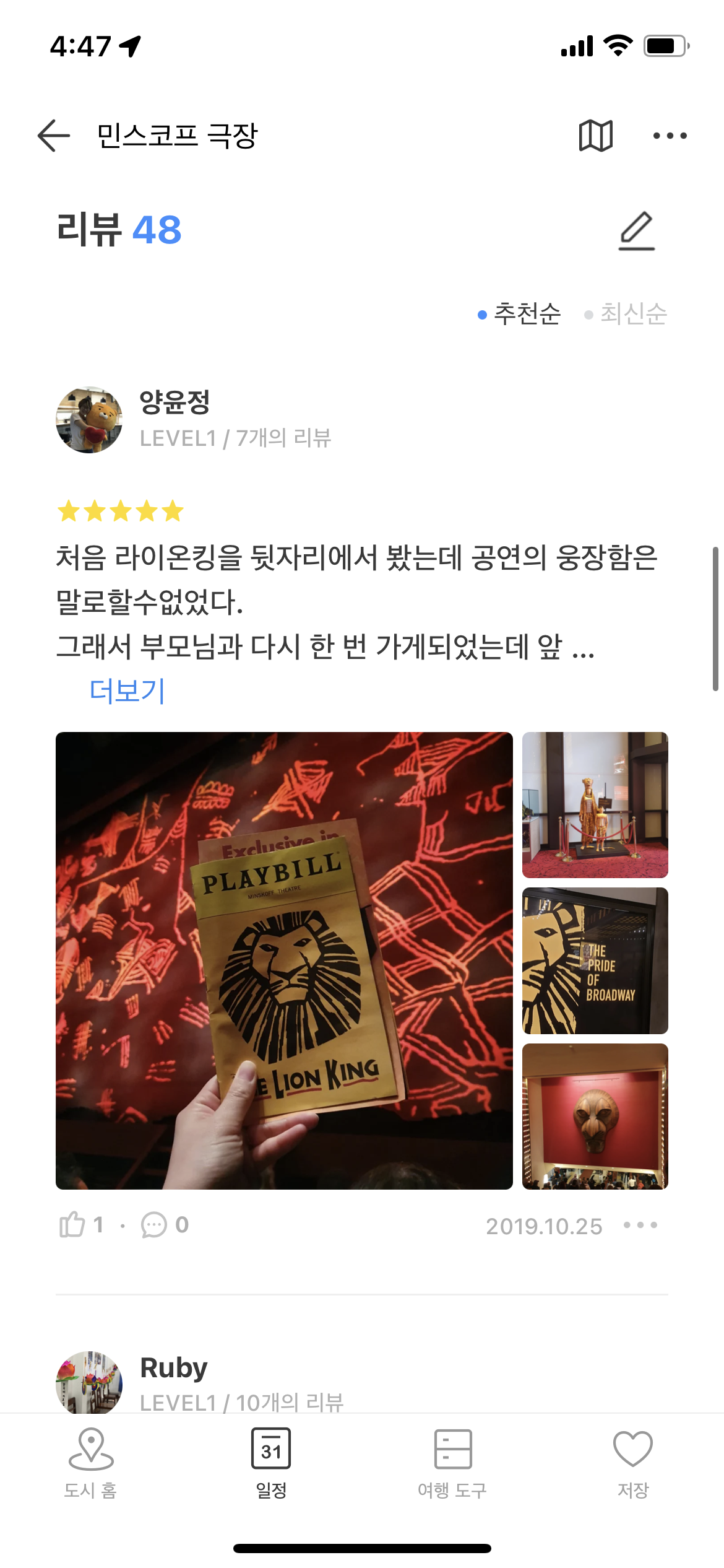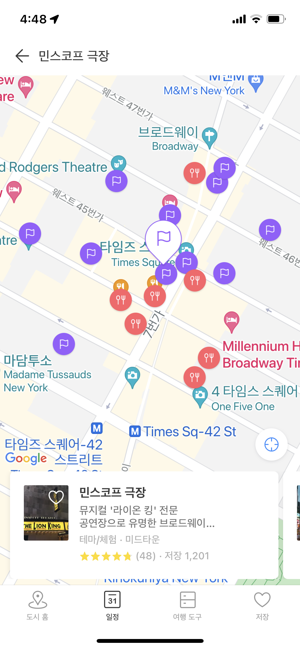UX/UI의 개선점을 찾기 위해서는 먼저 유저 Flow(=페르소나, 저니 맵 등)를 고려해야 한다. 사용자가 어떤 부분에서 불편함을 느낄지 추측할 수 있어야 하기 때문이다. 그래서 나는 뉴욕 여행을 계획 중인 페르소나를 가정하고, 해당 페르소나가 트리플을 통해 뮤지컬 <라이온 킹> 감상하는 날의 여행 일정을 짜는 과정을 따라가보려고 한다. 페르소나는 현재 <라이온 킹> 티켓의 예매를 마친 상태이고, 뮤지컬 감상 이후 저녁 식사를 먹을 근사한 현지 레스토랑을 찾고 싶다는 니즈를 갖고 트리플에 접속했다.