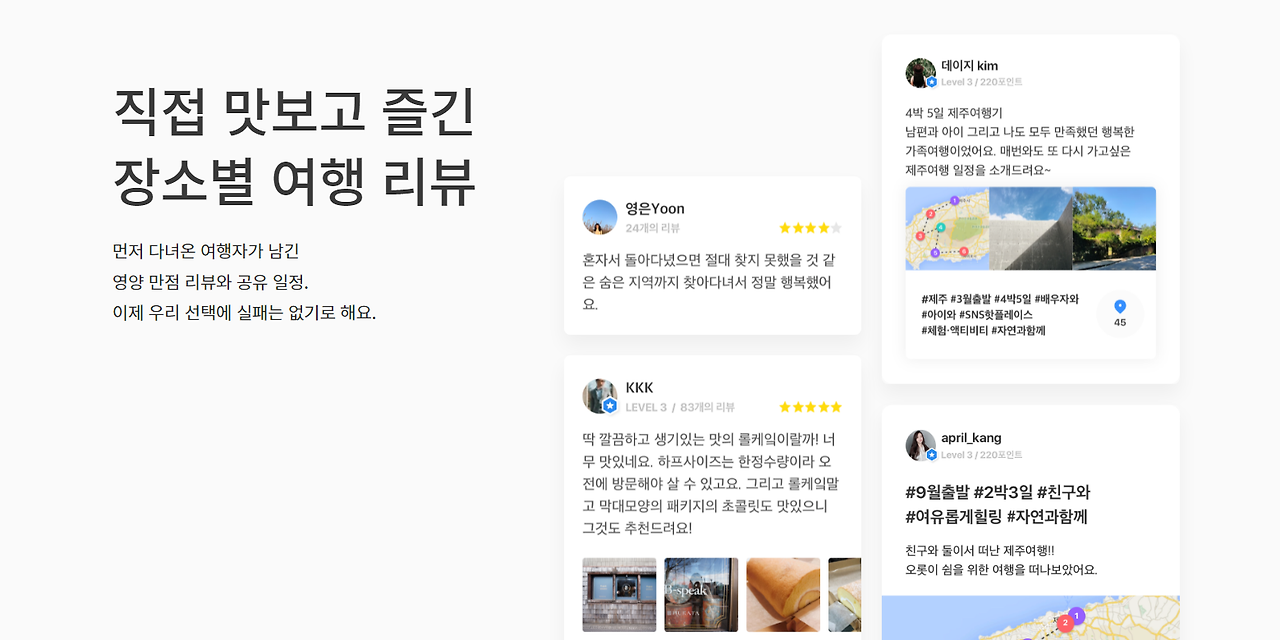 트리플이라는 서비스를 분석한 다양한 아티클에 의하면, 트리플은 코로나19로 해외 여행이 사실상 불가능에 가까워진 상황에서 국내·해외 여행을 포괄한 '여행의 모든 것'을 다루는 서비스로 피봇팅을 시도했다. 트리플의 랜딩 페이지에서도 피봇팅의 흔적을 엿볼 수 있었다. 랜딩 페이지에 삽입된 이미지(Ex. 리뷰 이미지, 지도 이미지 등)가 전부 국내 여행 관련 이미지였다. 또한, 서비스의 정체성을 드러내는 카피에도 '국내여행'이라는 키워드를 필수적으로 언급하고, 또 강조하고 있다.