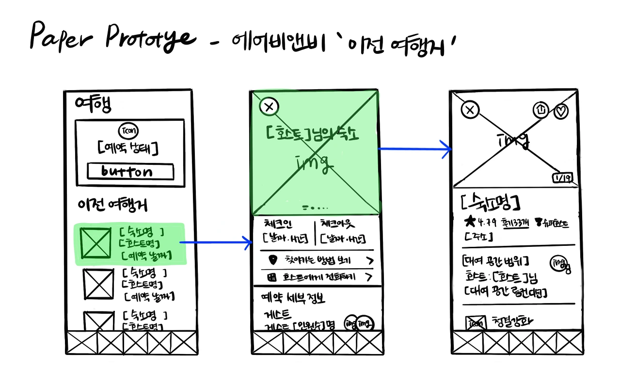 말로만 설명하려니 UX/UI 측면에서의 사용자 여정을 제대로 나타내기 어려웠다. 그래서 과제에 안내된 대로 페이퍼 프로토타입을 그려보았다. 초록색으로 표시된 부분은 터치 영역이고, 파란색 화살표는 페이지 이동을 의미한다. 위와 같은 페이퍼 프로토타입에서 도출한 에어비앤비 '이전 여행지'의 핵심 기능은 다음과 같다.