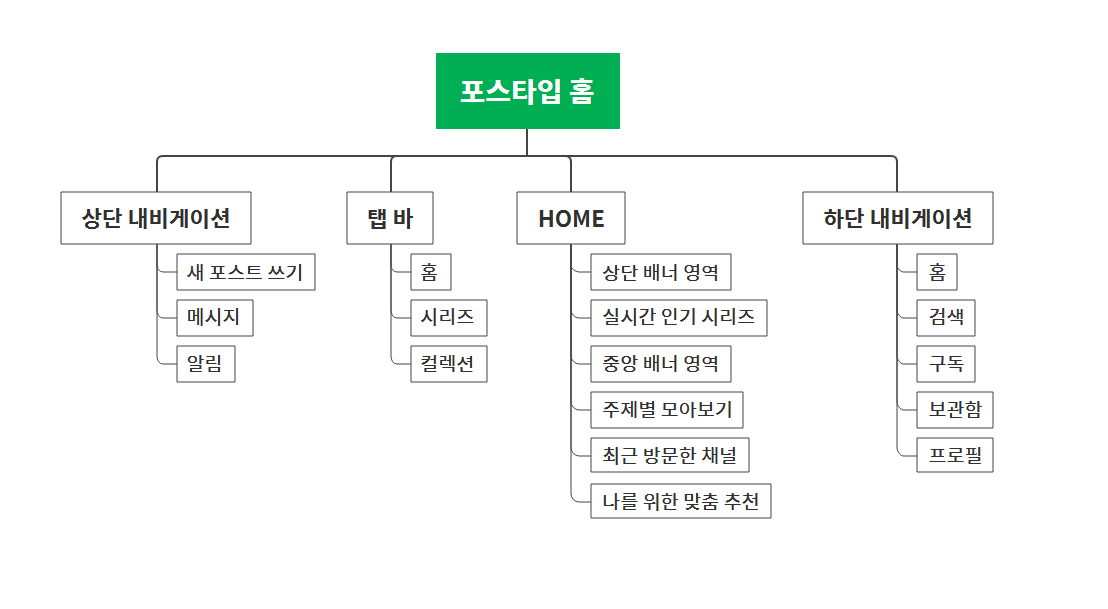 다음으로는 포스타입 스티커를 실제 서비스에 도입하게 되었다는 가정 하에 정보 계층 구조도(IA)를 그려보려고 한다. 맨 위에 설명한대로 포스타입 앱을 기준으로 IA를 작성했다. 포스타입 스티커가 IA의 어떤 위치에 추가되면 좋을지 고민하는 과정을 그대로 담기 위하여 IA를 그리는 중간중간 캡쳐를 했다.