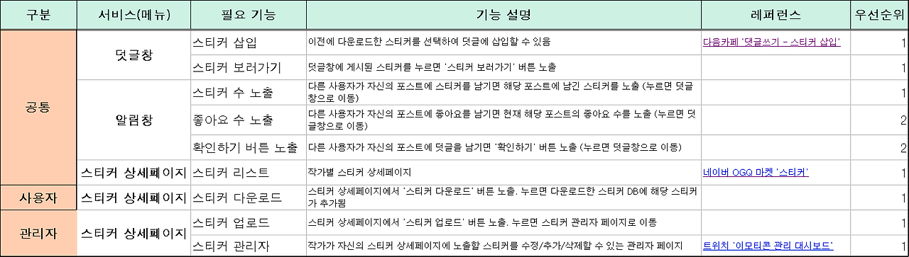 위와 같이 리스트업한 기능을 요구사항정의서 양식에 맞추어 다시 작성했다. 이 과정에서 기능에 대한 설명(=디스크립션), 이해를 돕기 위한 레퍼런스, 그리고 기능별 우선순위를 추가했다.