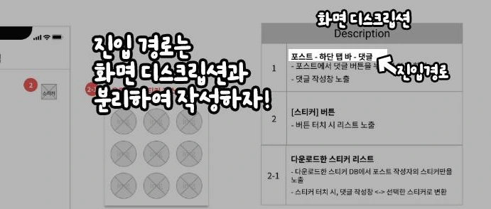 세 가지 스토리보드의 '1번' 디스크립션의 타이틀(볼드체 영역)의 경우, 진입경로에 해당한다. 진입경로는 화면 요소에 대한 디스크립션이 아니기 때문에 별개로 다뤄주는 방향으로 수정하는 것이 좋다. (이때 하이픈(-) 대신 중괄호(>)를 사용하면 이해가 더 빠르다.)
