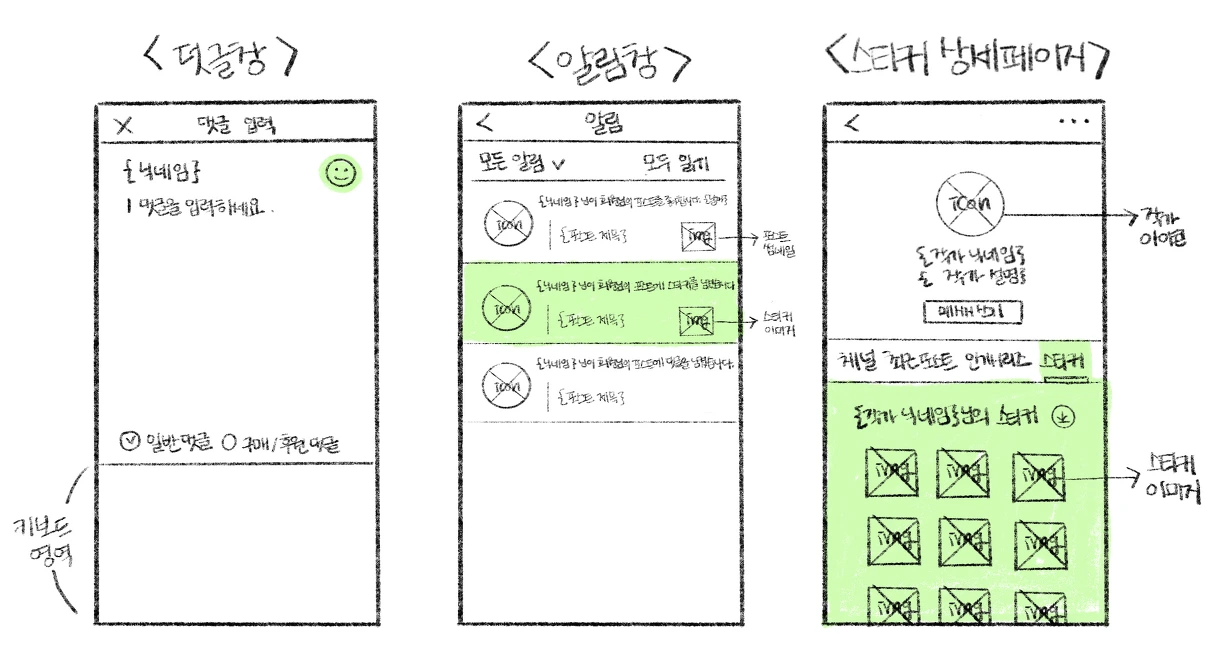 요구사항정의서에 따르면, 포스타입 스티커를 도입했을 때 포스타입 앱에 추가되어야 할 메뉴는 덧글창/알림창/스티커 상세페이지이다. 실제 사용자에게 제공될 버전은 이보다 deep하겠지만, 현재는 MVP 기획 단계이므로 각 메뉴의 대표격이 되는 페이지만 프로토타이핑하기로 했다. Figma로 와이어프레임을 구성하기 앞서, Lo-Fi Prototype을 그렸다.