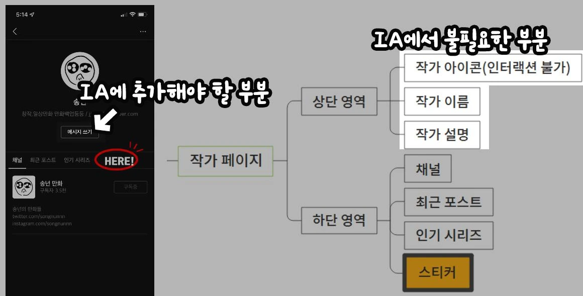그리고 작가 페이지까지 도달해서야 비로소 내가 기획한 기능, 포스타입 스티커가 등장하게 된다. 위 캡쳐 사진의 빨간색 동그라미로 표시된 부분이 스티커라는 메뉴를 추가할 자리이다. 위 IA 상에서는 스티커 메뉴를 노란색 바탕으로 표시했다.