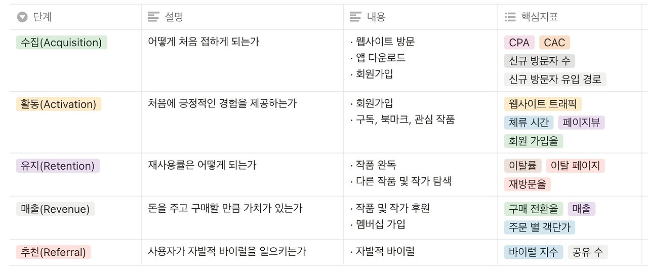 여태까지 4주에 걸쳐 포스타입이라는 서비스를 분석한 내용을 바탕으로 AARRR 퍼널 단계를 정리해보았다.