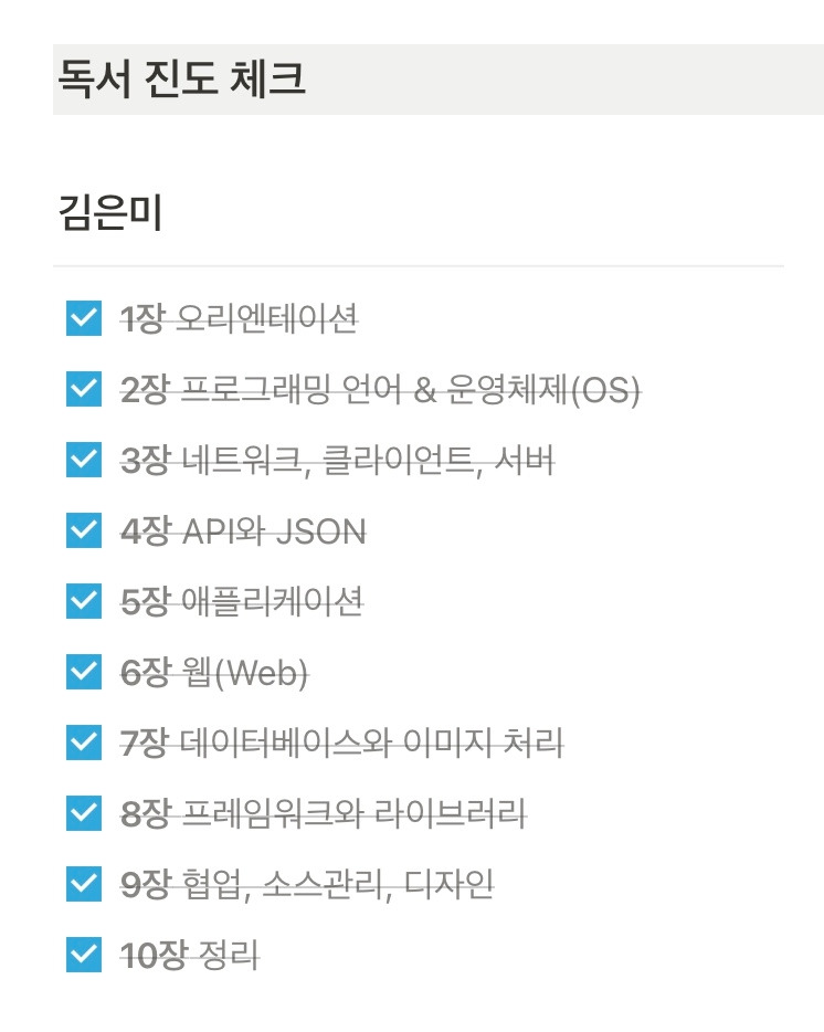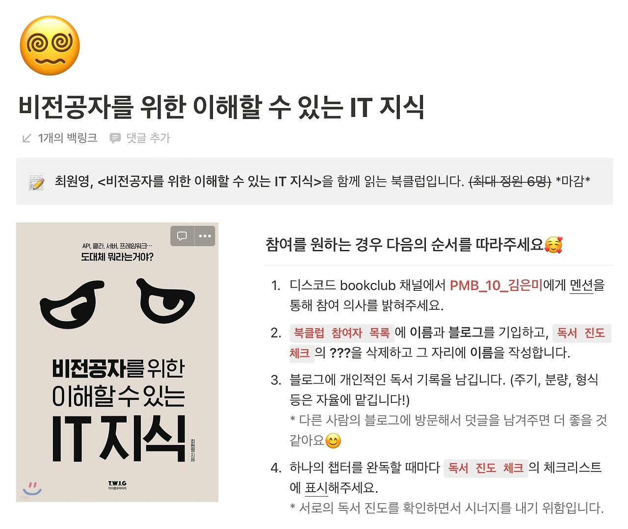 카카오 이모티콘의 데이터 흐름을 이해하는 과정에 <비전공자를 위한 이해할 수 있는 IT 지식>을 읽어두었던 것이 매우 많은 도움이 되었다. 예전부터 이 책을 꼭 한 번 읽어보고 싶다고 생각했기 때문에, 부트캠프에서 수강생들끼리 북클럽을 꾸릴 수 있다는 말을 듣자마자 사람들을 모아서 위와 같은 페이지를 만들고, 함께 독서를 했었다.