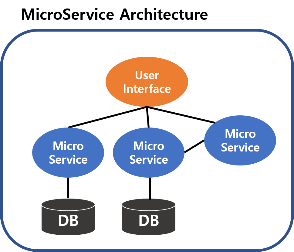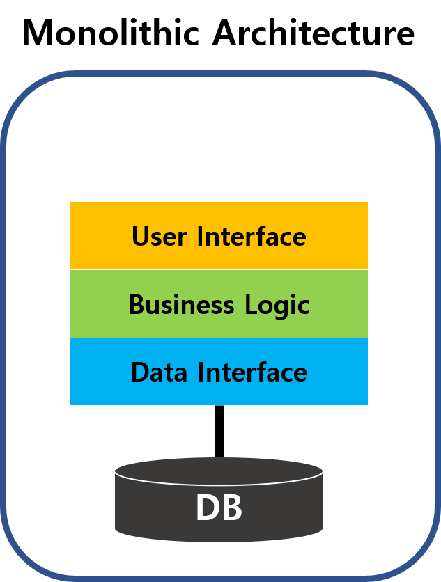 MSA란 기존 아키텍처의 단점을 보완하고자 나온 여러 아키텍처 중 하나로, 프로젝트의 규모가 커질수록 복잡도가 심각하게 증가한다는 기존의 Monolithic Architecture를 대체하기 위해 쓰인다. 사용자 입장에서는 카톡이라는게 하나의 서비스 같아 보이지만, 사실은 카카오 선물하기, 카카오 이모티콘, 카카오 뷰 등 작은 서비스 여러 개가 모여서 하나의 시스템을 제공하고 있다는 뜻.