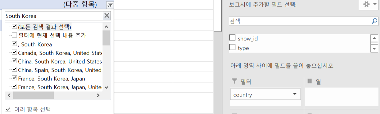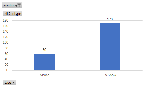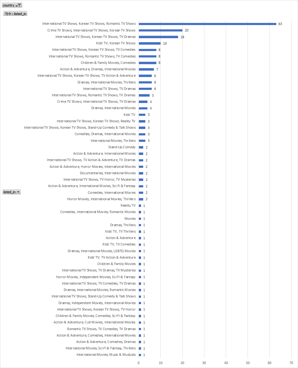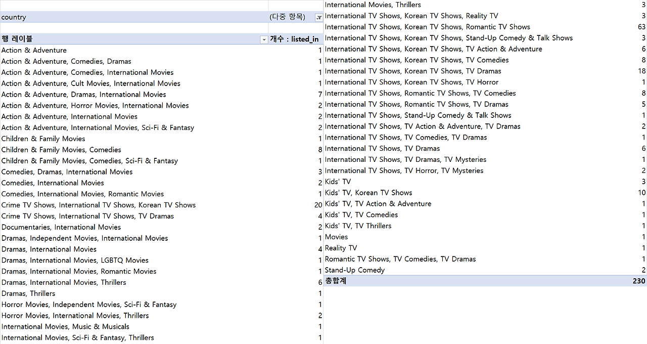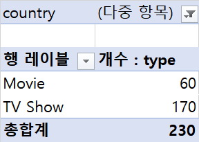 두 개의 가설을 검증하기 위하여 엑셀의 피벗 테이블 기능을 활용하여 데이터를 확인했다. 먼저, country를 기준으로 필터를 적용했다. country 컬럼 'South Korea'가 포함된 항목을 다중 선택했다. [1번 가설]을 확인할 때는 type 컬럼을 행에 배치하고, [2번 가설]을 확인할 때는 listed_in 컬럼을 행에 배치했다. 그리고 이들의 개수를 값으로 구했다. 그랬더니 다음과 같은 결과가 도출됐다.
