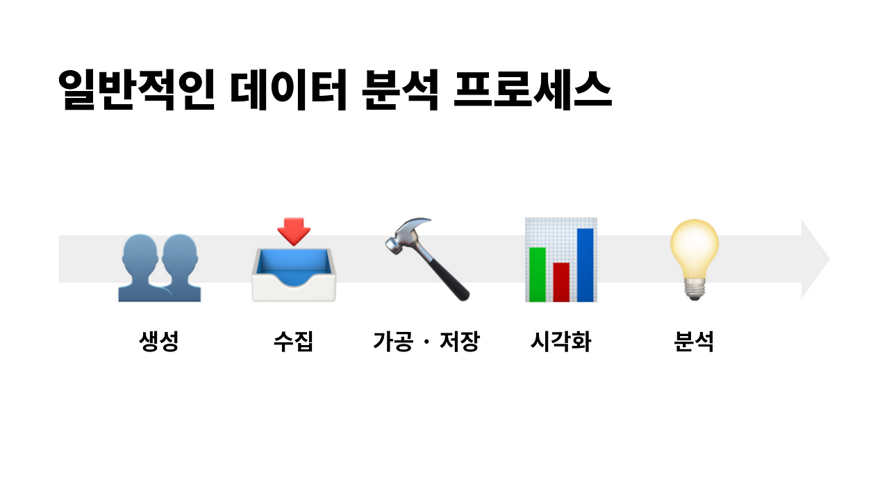 오늘은 위와 같은 프로세스 중, 생성과 수집을 제외한 가공·저장부터 분석까지의 과정을 간단하게 연습해보려고 한다. 데이터 분석 도구는 매우 다양하게 마련되어 있다. 그중에서도 가장 보편적으로 사용되는 것은 SQL과 파이썬이다. 특히 파이썬은 비전공자도 비교적 쉽게 배울 수 있고, 라이브러리를 사용한 데이터 시각화가 비교적 용이하여 많은 사랑을 받고 있다.