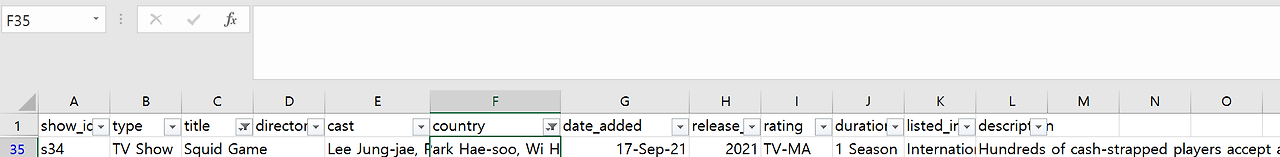 country 컬럼에서 (필드 값 없음) 필터를 적용하니 country에 어떤 값도 적히지 않은 콘텐츠가 무려 전체의 1/10에 달했다. 그중에는 넷플릭스의 초대박 K-콘텐츠, <오징어 게임>도 포함되어 있었다(...). 쉽게 말해 <오징어 게임>을 포함한 약 800개의 콘텐츠의 제작 국가가 '없음'으로 잘못되어 있었단 뜻이다.