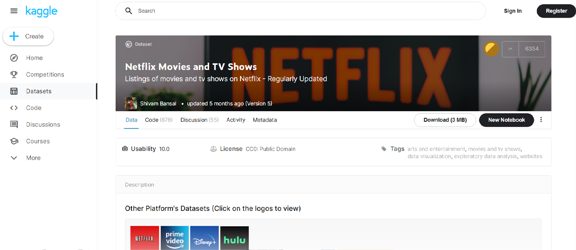 이렇게 데이터 분석을 위한 도구는 정했는데, 무엇을 분석하면 좋을지는 결정하지 못한 상태였다. 데이터를 무료로 구할 수 있는 사이트, Kaggle(참고)을 둘러보던 중 익숙한 기업의 데이터를 발견했다. 바로... 내가 정말 자주 이용하는 서비스이지만 아직 한 번도 분석하지 않은 서비스, OTT 플랫폼의 절대강자, 넷플릭스(투둠-).