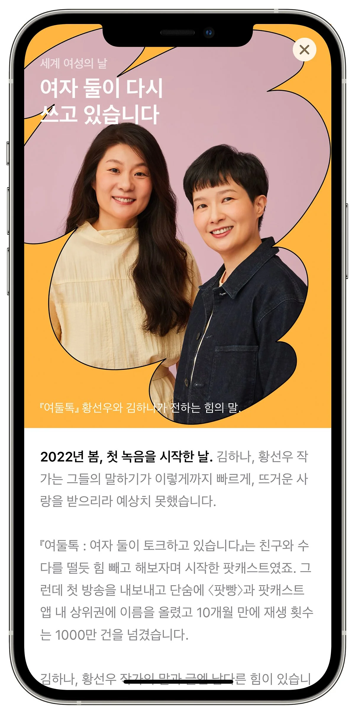 내가 가장 좋아하는 팟캐스트는 <여자 둘이 토크하고 있습니다(이하 여둘톡)>이다. 이 팟캐스트의 공동 진행자인 황선우, 김하나 작가님은 화제의 에세이 『여자 둘이 살고 있습니다』를 써내며 '조립식 가족'이라는 형태의 공동 생활을 제안하며 많은 2030 여성들의 힘이 되어 주기도 했다.