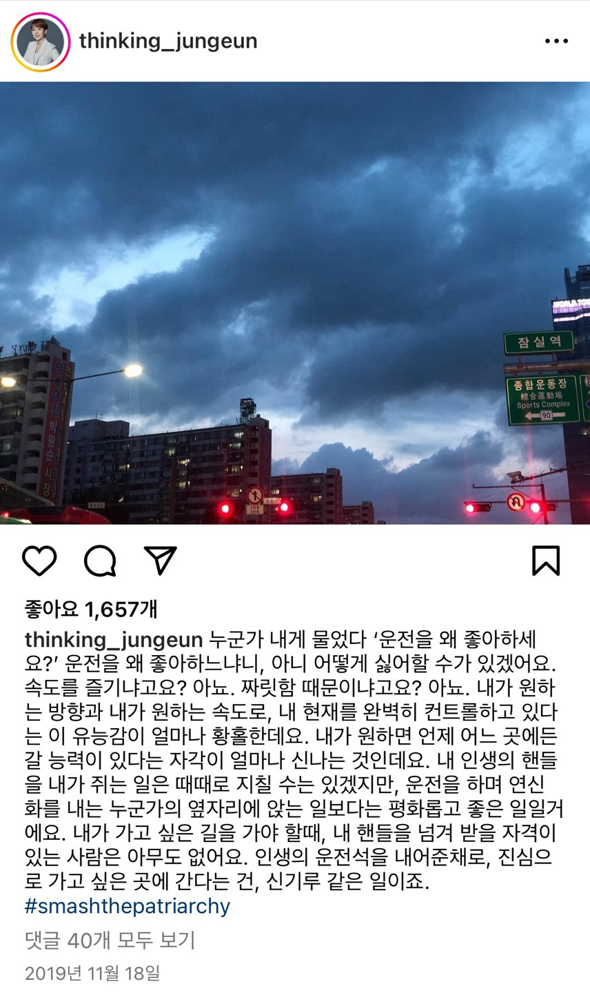 그럼에도 "꼭 운전을 해야 하나?"라는 의문에 사로잡힐 때는 곽정은 작가의 인스타그램 게시글을 떠올리려고 한다.