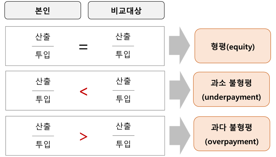 셋째, 그 해의 최저임금이나 아이를 봐주는 ‘이모님’들과 비교해봤을 때 서운함이 없어야 한다. ‘딸아이 봐주는 내 친구’ 또는 ‘며느리 아이 봐주는 내 친구’와 비교해봤을 때 섭섭한 마음이 들면 안 되는 것이다. 여기서 잊지 말아야 할 중요한 비교 대상자는 ‘요즘 아이 봐주는 이모님’들의 임금이다. ‘요즘 애들 봐주는 사람들은 00만 원 받는다더라~’라는 말과 비교하여 서운함을 느낄 수도, 자식 부부에게 고마움을 느낄 수도 있다. 이것은 심리학에서 Adams가 1965년에 주장한 형평 이론에서도 나오는 것인데 나의 투입(input)과 산출(output)을 특정 대상과 비교하여 형평(equity)한 지, 내가 남들보다 조금 받고 있는 불형평(underpayment)인지, 내가 남들보다 많이 받고 있는지(overpayment)인지 결정한다는 것이다. 이 이론에 따르면 아이를 돌봐주시는 시어머니가 뉴스 속 나오는 저 이모님과 비슷한 정도의 일을 하고 있는 것 같은데 임금을 조금 덜 받고 있는 것 같다고 느끼면 불형평 상태가 되어 섭섭함이나 불만족을 느낄 수 있다.
