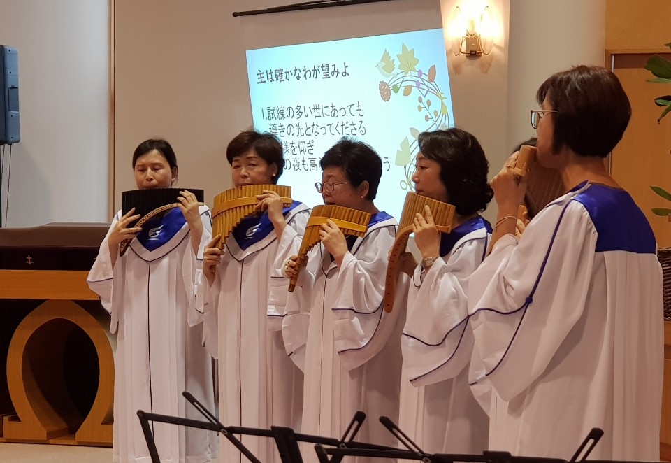 이번 성가대에 합류한 여섯 분의 팬플룻팀 이 계신다. 한 분은 손에 화상을 입으신 채, 한분은 저 멀리 순천에서부터...... 저마다 같은 소리로 음악선교를 하시려고, 연습과 선교 바자에 도움까지 아무런 불평 한 마디 없이 그림자처럼 참석하신 '루아흐' (하나님의 숨결 생기 그런 뜻이래요. 호흡을 통해 악기로 주님을 찬양하는) 팀의 모든 천사 같은 분들께 잠시 지면을 통해 인사드립니다.