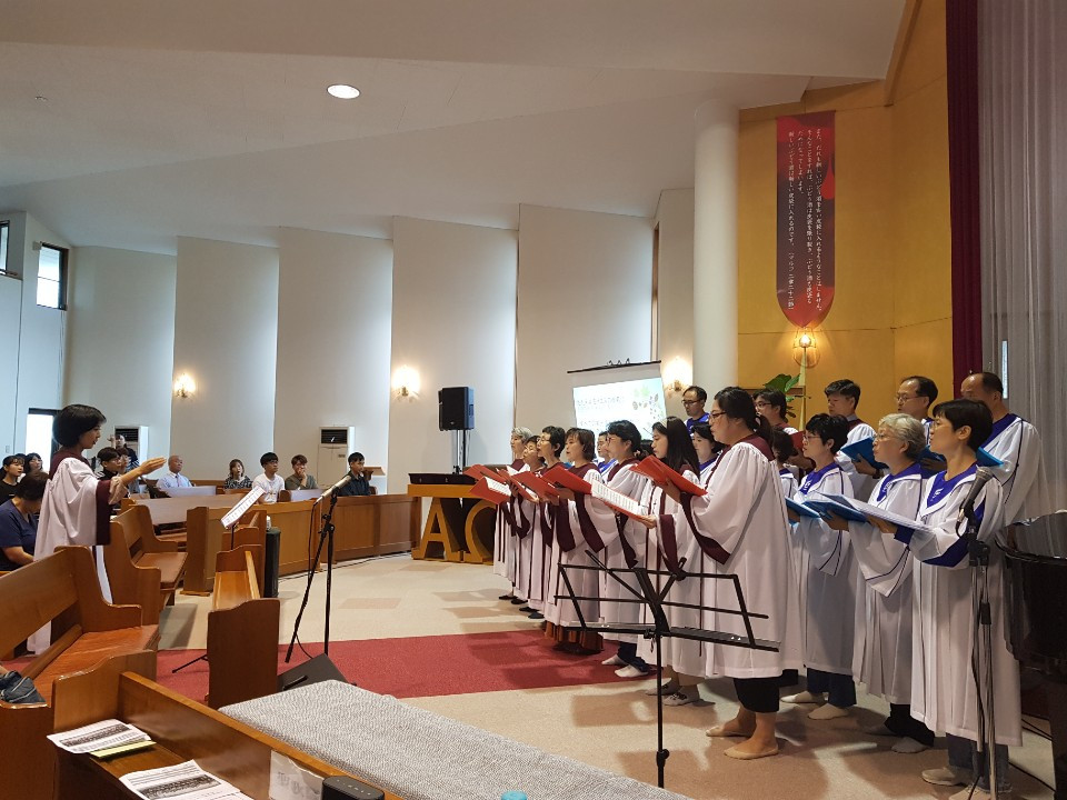 드디어 땅밟기부터 전 던지까지 이어진 결과의 열매가 이루어진 2019년 9월 22일 11시 주일 예배가 하카타 교회의 사미 목사님의 사회로 시작되었다.
