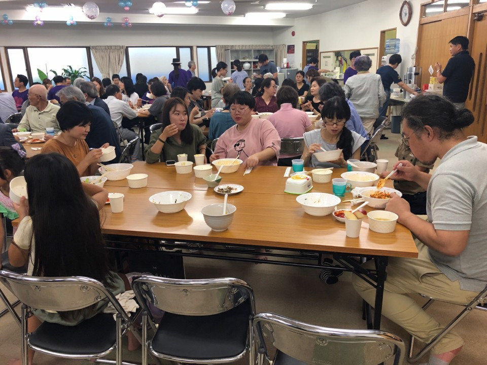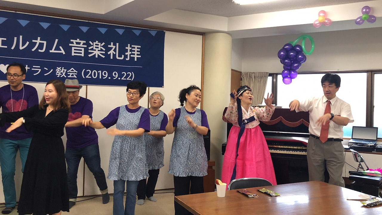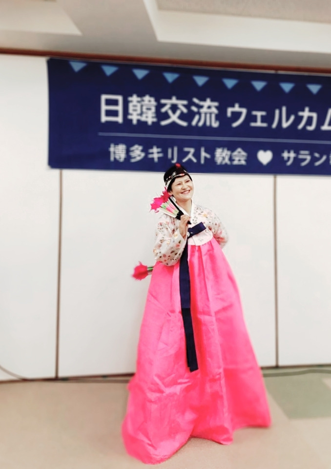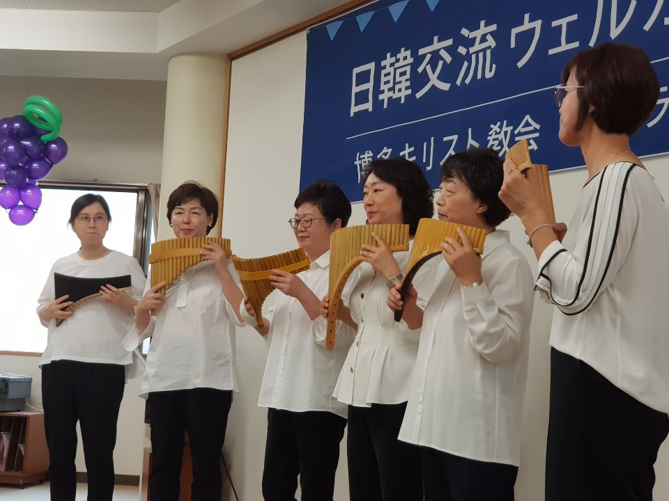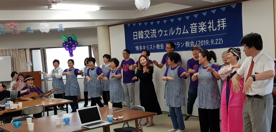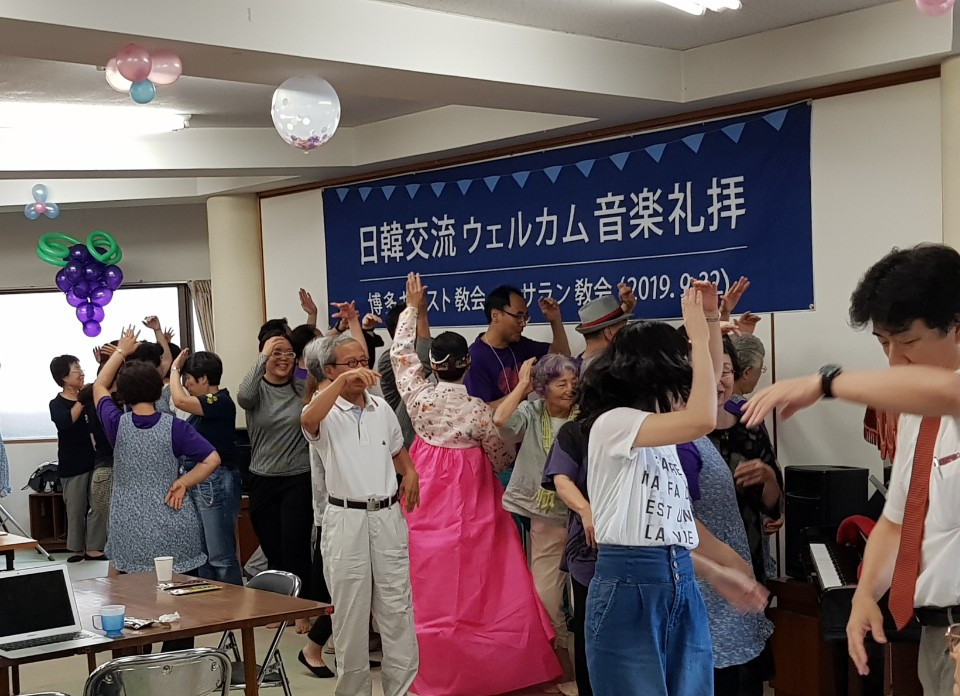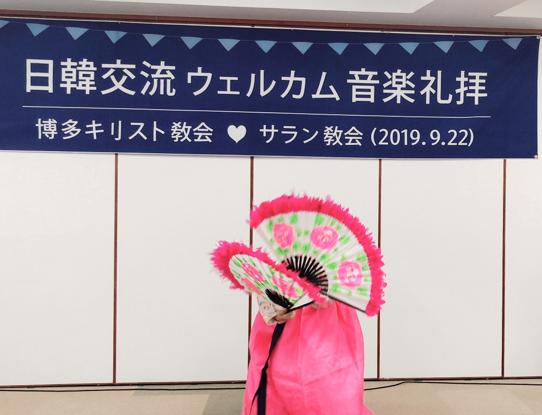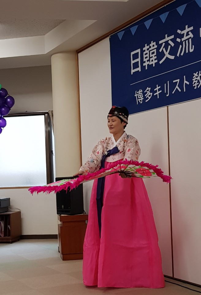 맛나게 점심 식사 후에 이어진 2부 순서는 먼저 루아흐팬플릇팀의 (루아흐라고 하나님의 숨결 생기 그런 뜻이래요 호흡을 통해 악기로 주님을 찬양) 흥겨운 합주, 그리고 몇십 년의 노하우를 갖고 계신 가수 민옥기 집사님의 엔가와 트로트 그리고 퀴즈 순서였습니다. 하카타 교회의 청년들이 눈빛을 빛내며 퀴즈에 도전하는 모습에 깜짝 놀라기도 했고요. 그렇게 뜨겁게 오른 분위기를 제가 센다이 교회 시절 이후 근 20년 만에 녹슨 동작으로 선보인 부채춤 뒤에 그곳분들과 하나로 어우러졌던 밀양아리랑이었습니다. 저 휘가 춘 춤을 모든 분들이 서서 , 나오셔서 같이 어우러지며 추어 대던 춤사위에서 모두가 하나라는 , 모두가 하나님의 자식들이라는 진실을 말해주었습니다.