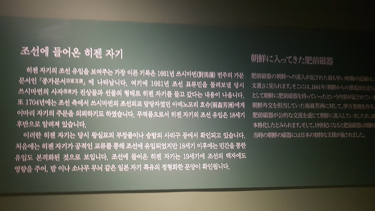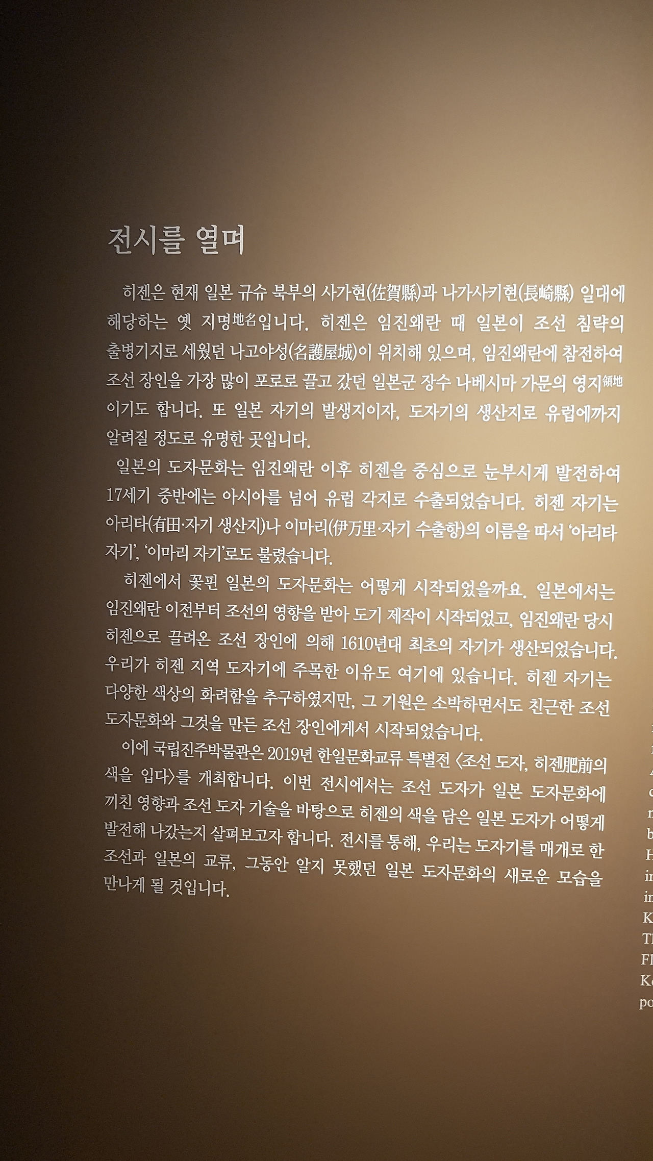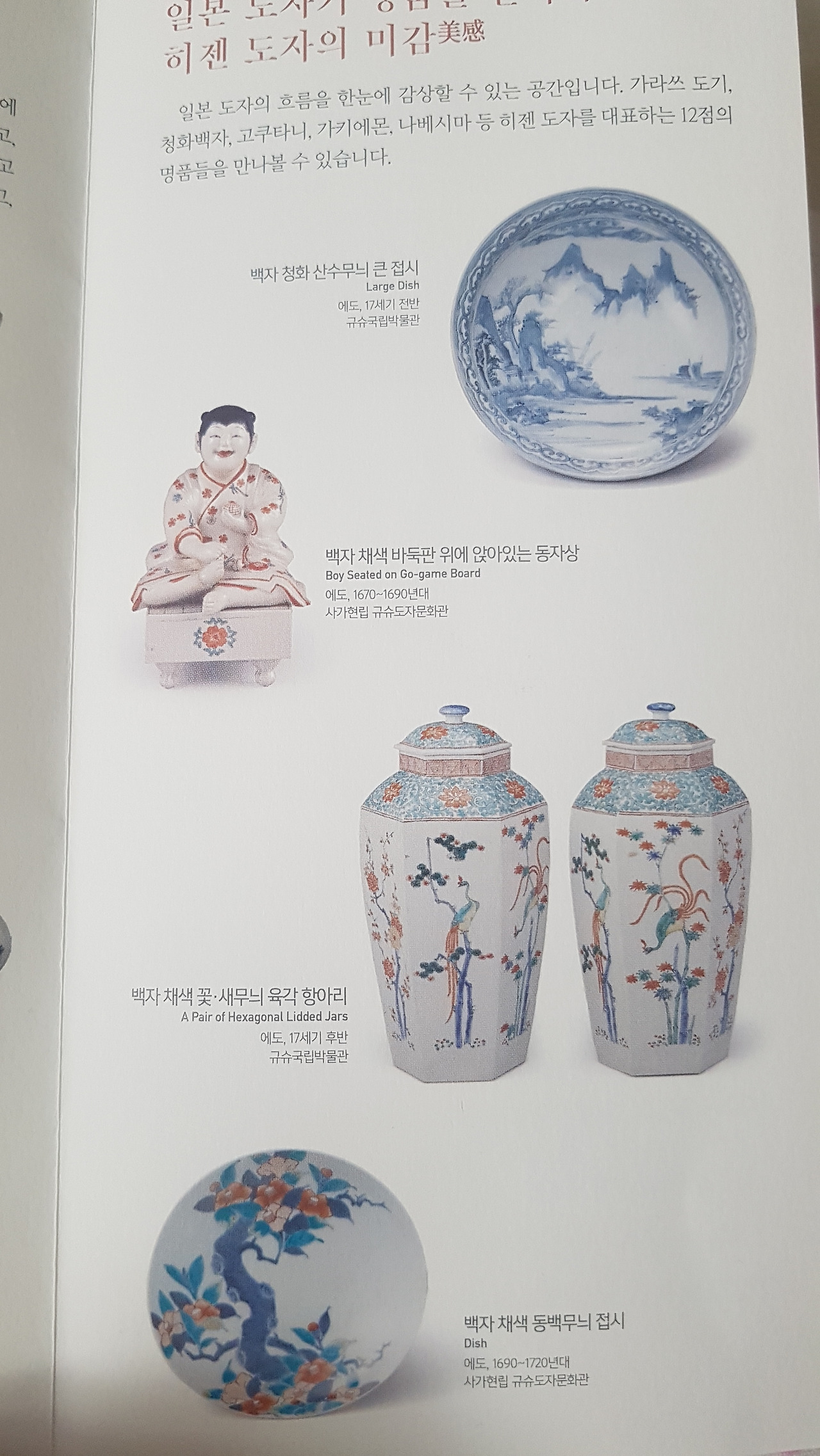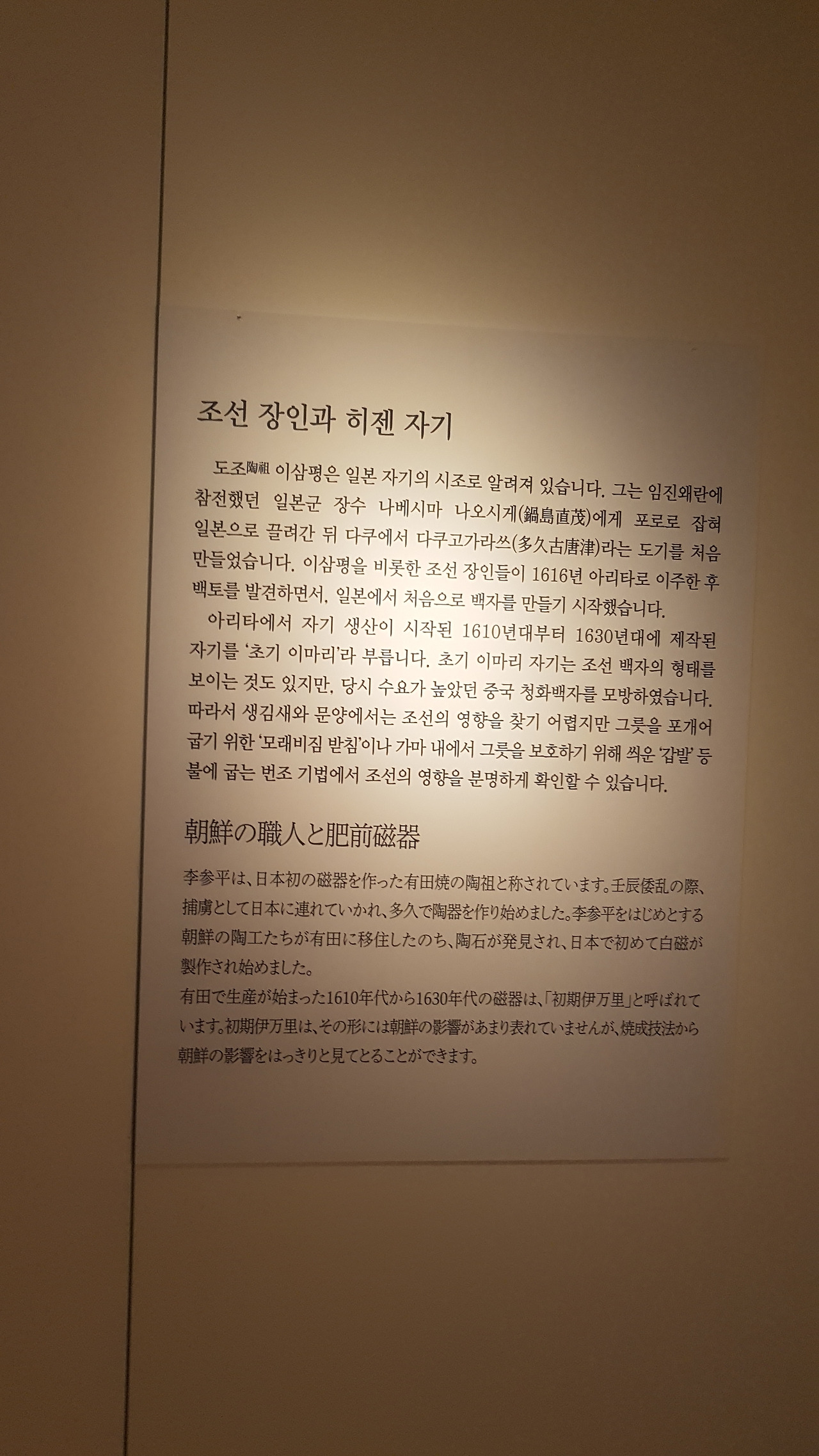 '조선 도자 히젠의 색을 입다 ' (일본의 12점은 사진 촬영이 금지라...) 히젠은 현재 규슈 북부 사가현과 나가사키현 일대의 엣 지명입니다. 임진왜란 당시 히젠으로 끌려간 조선 장인은 1610년 일본 최초의 자기를 만들었고 , 이를 시작으로 일본 도자 문화는 비약적으로 발전하게 되었습니다.