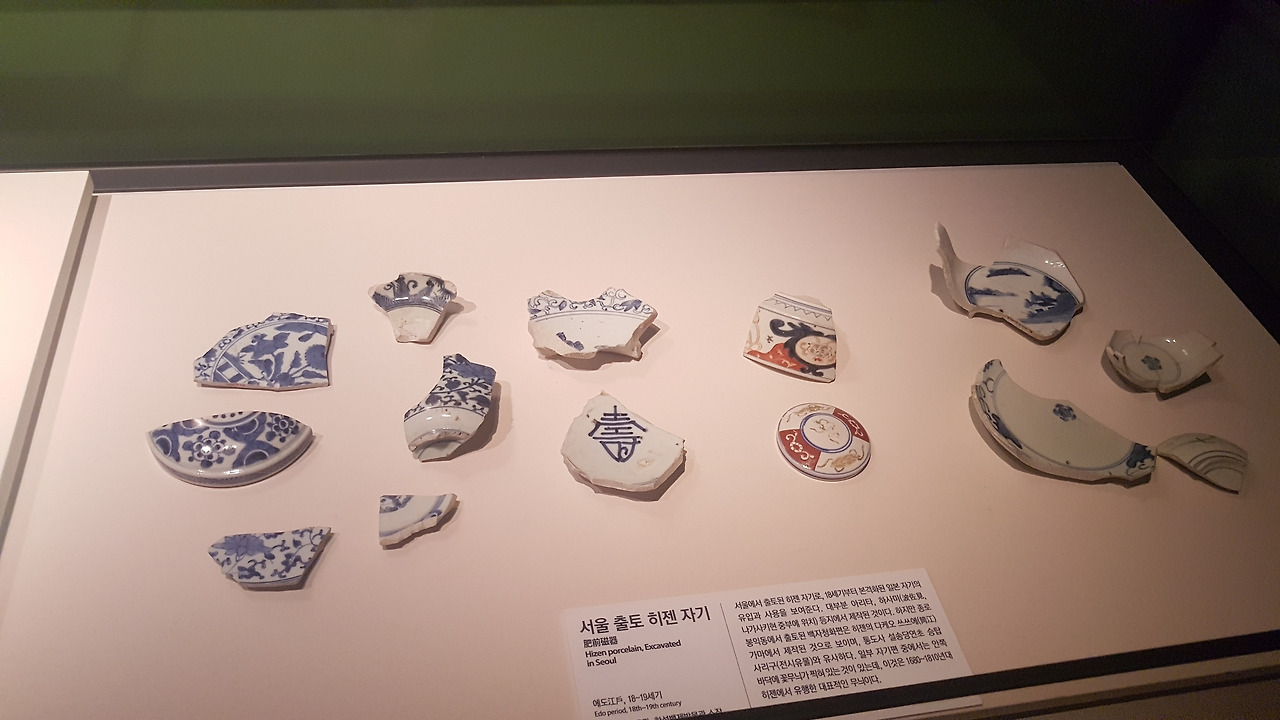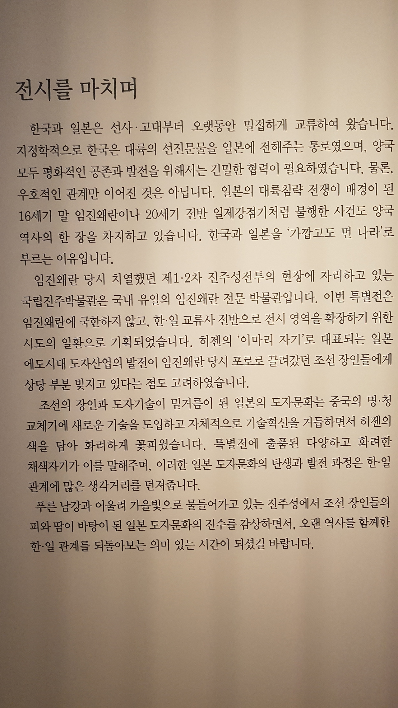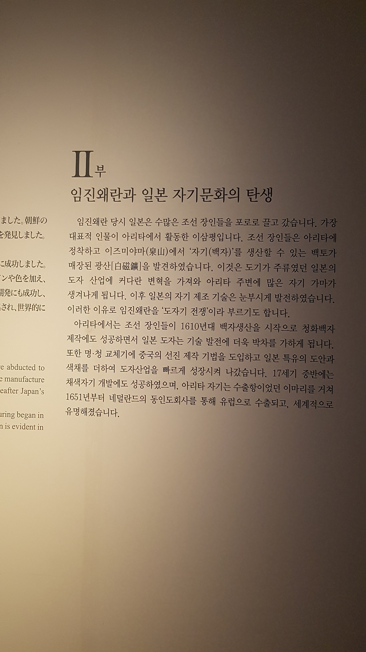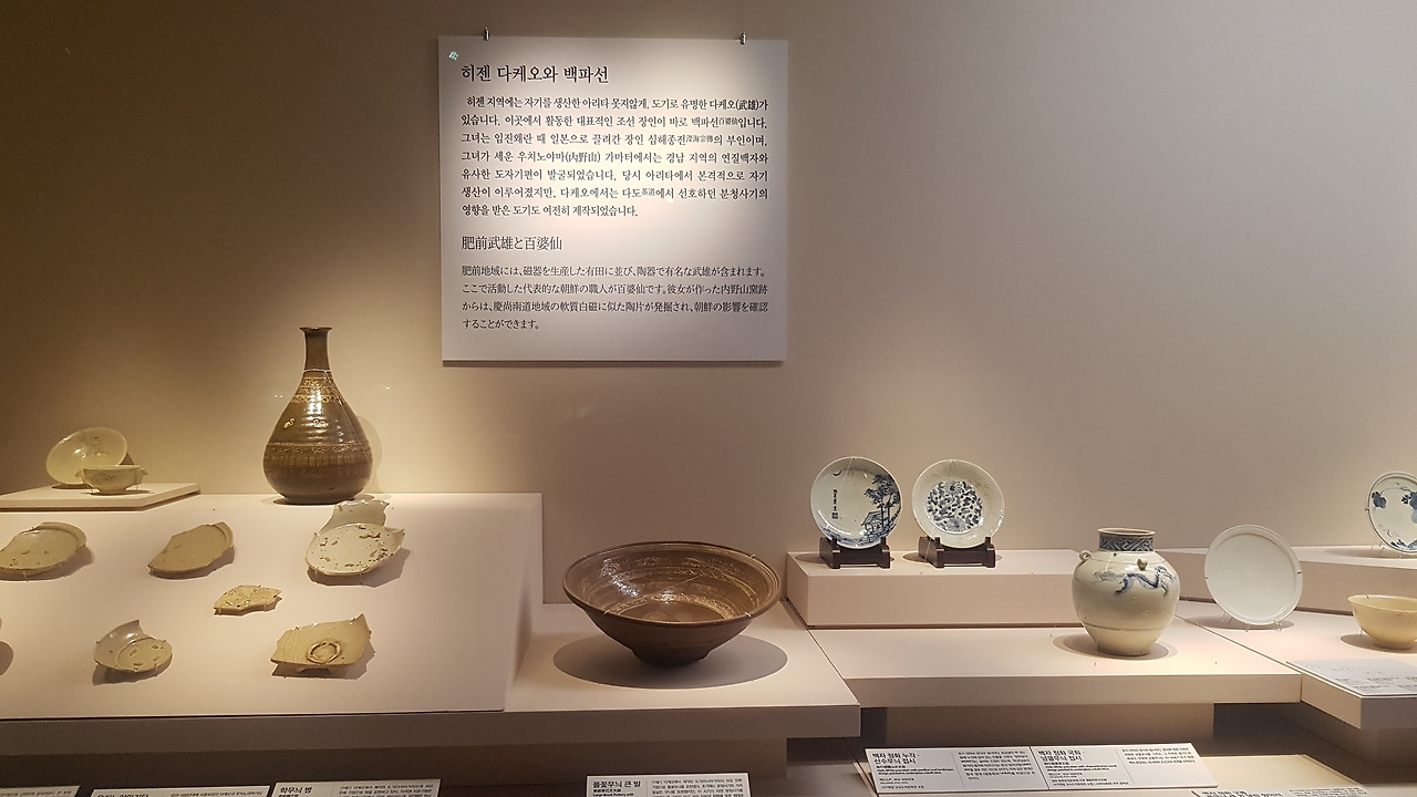 '조선 도자 히젠의 색을 입다 ' (일본의 12점은 사진 촬영이 금지라...) 히젠은 현재 규슈 북부 사가현과 나가사키현 일대의 엣 지명입니다. 임진왜란 당시 히젠으로 끌려간 조선 장인은 1610년 일본 최초의 자기를 만들었고 , 이를 시작으로 일본 도자 문화는 비약적으로 발전하게 되었습니다.