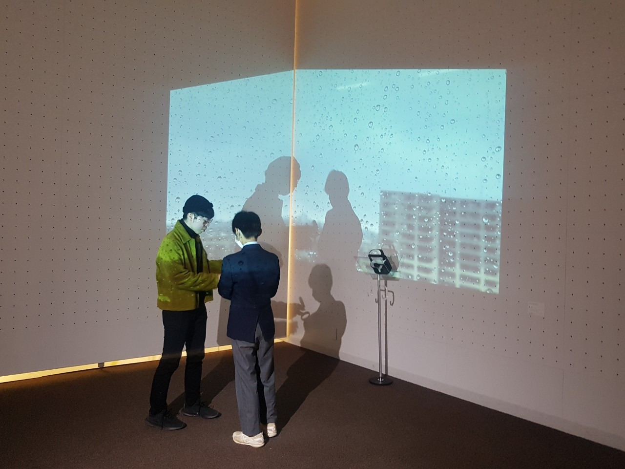 가상의 현실로 들어 서던 구경 온 교복의 중학생에게 설명하는 작가.