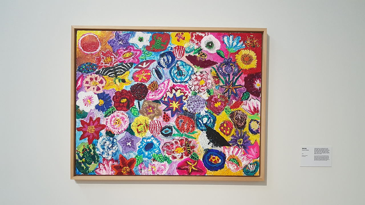 1부 ‘전통과 아방가르드’에 나온 작가의 1964년 작 <추상>. 서구 앵포르멜과 추상표현주의의 직접적인 영향을 보여주는 작품이다. 한국 전통 서예의 획을 떠올리게 하는 역동적이고 거친 선들이 화면에 도드라진다. 작가는 정선, 김홍도 같은 전통 거장처럼 머릿속에 풍경을 담아놓고 화폭에서는 자기 식으로 구도와 색감을 바꿨다. 그리는 방식도 과거 몰두한 추상 그림과 실험미술 작업하듯이 했다. 칠하는 게 아니라 물감을 툭툭 던지듯 입히고, 손가락과 손바닥으로 물감 덩어리를 으깨어 바르고 휘저었다. 형식과 내용에서 하나로 틀 잡을 수 없는 화풍을 빚어냈다. 부인과의 작별은 서구 추상 사조, 전위 미술의 흐름을 주시해온 1960~70년대 청장년기 작업과도 작별하게 했다. 하지만 구상화로 틀었어도 추상의 자유정신과 전통회화의 아취는 사라지지 않고, 꽃·풀·새로 대표되는 색채 회화의 원형질로 남게 된다.