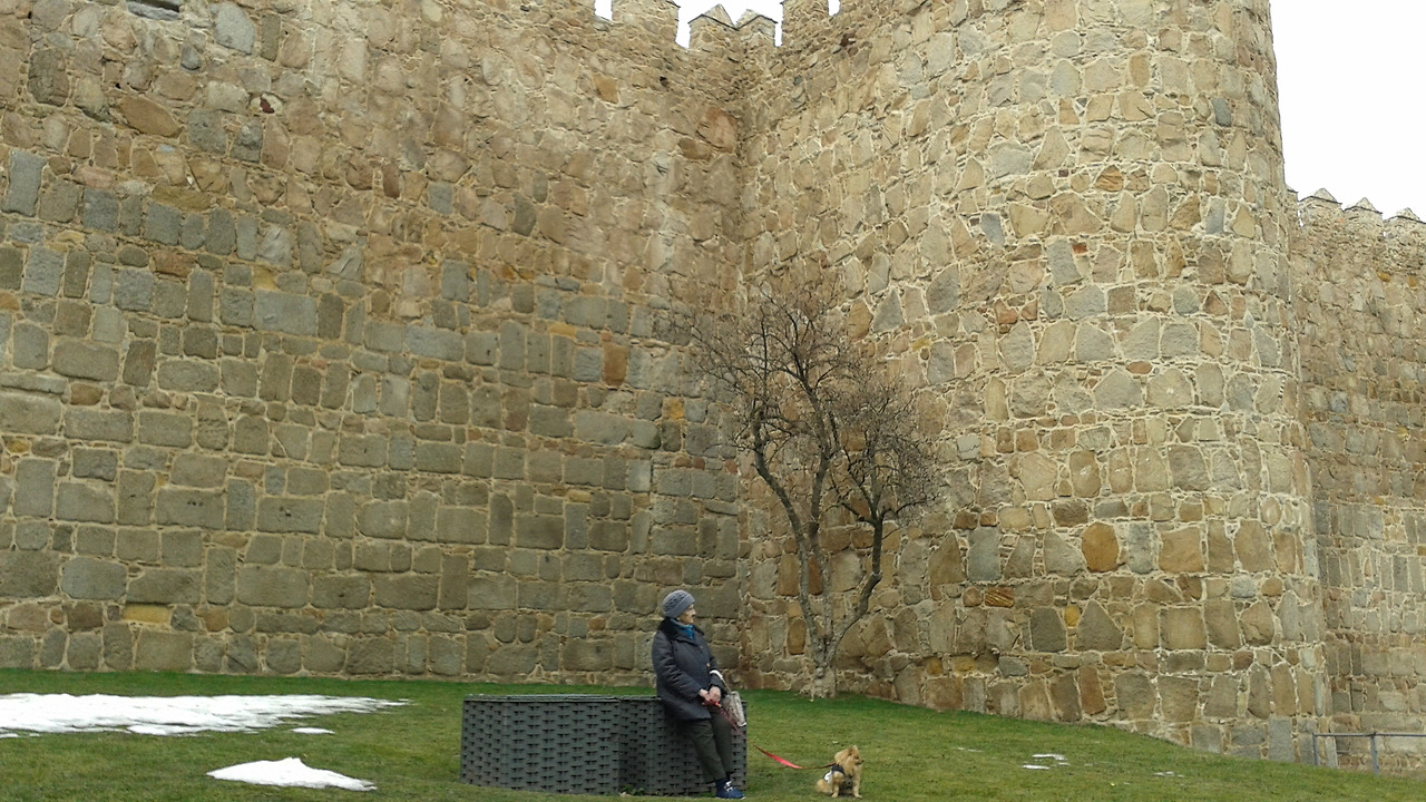 검은색 옷차림을 하고, 거대한 돌담 성벽이 뒤에 있는 푸른 잔디밭 위 커다란 조형 좌석에 다소곳이 앉아 쉬고 있는데, 손에는 강아지 한 마리를 연결한 줄을 잡고 있습니다. 강아지는 그녀와 몇 발치 떨어져 잔디에 앉아 휴식하고 있습니다. 한 폭의 그림 같습니다. 마음이 끌립니다. 강아지와 여인이 참 벗처럼 느껴집니다.