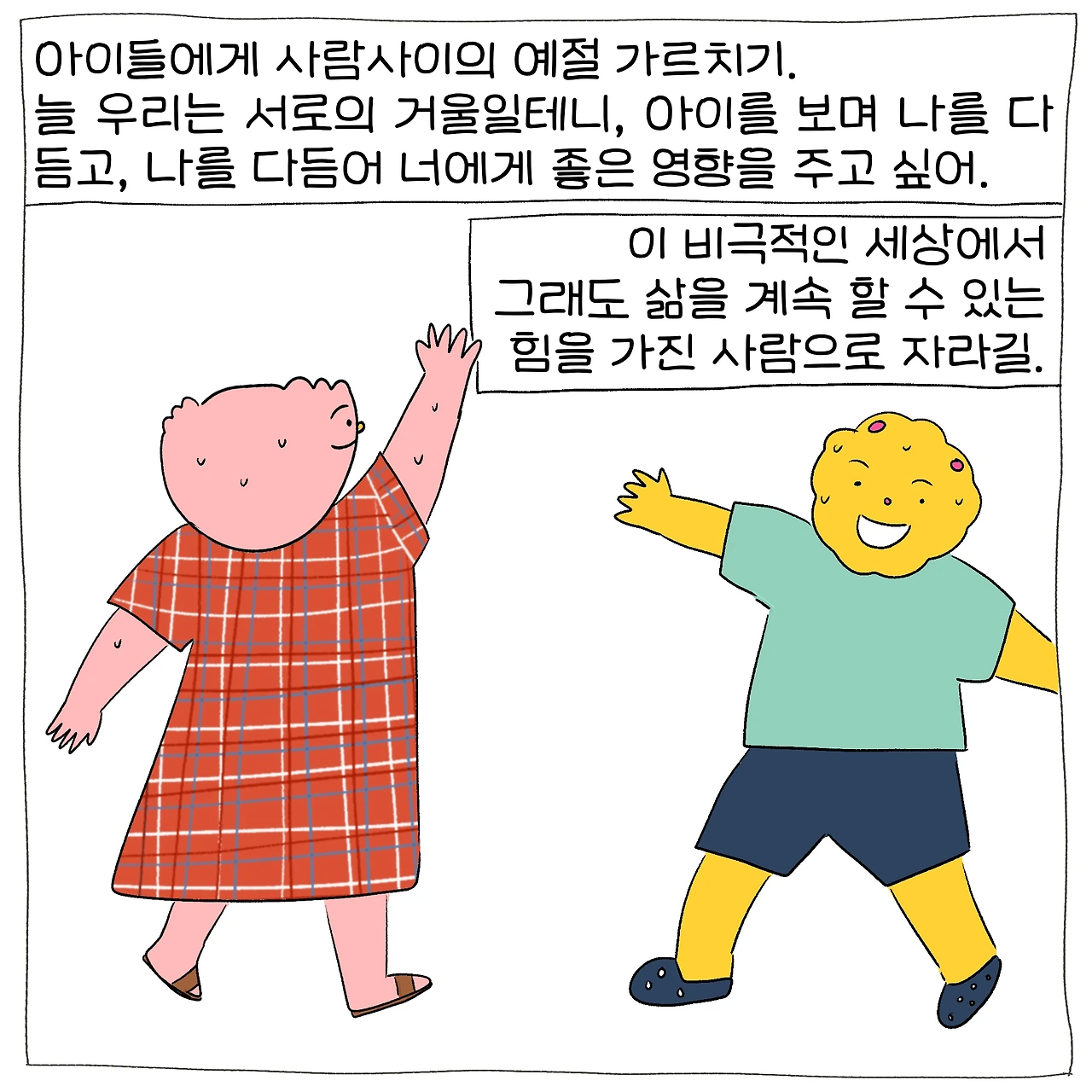 이 여름이 끝날 때, 우리는 또 어떤 현재와 미래를 만들어 가야 할까? 좀 더 눈과 귀가 열린 사람이 되야겠다. 몸과 마음 모두가 건강한 사람으로 살아야겠다. 마음 편하게, 마주하고 웃을 수 있는 미래를 선택하는 것, 지금 슬픔에 가라앉더라도, 소중한 사람과 차 한잔 마실 수 있는 미래. 밝고 건강하게 자랄 아이의 미래. 시간이 흘러도, 서로를 아끼는 마음은 변함없을 미래를 선택하는 것을 잊지 않아야지.