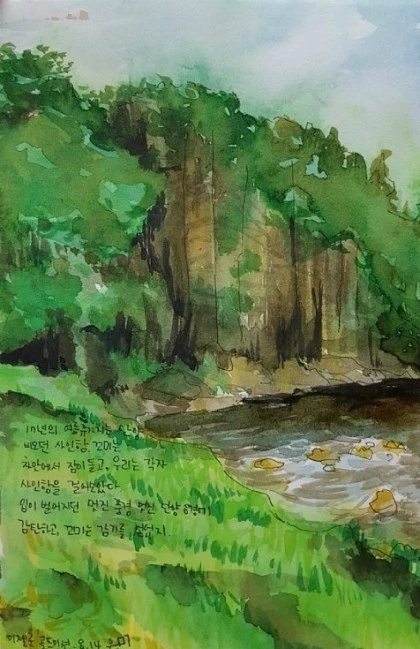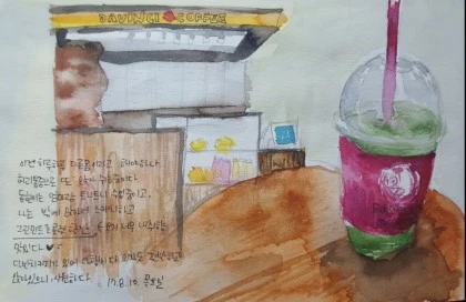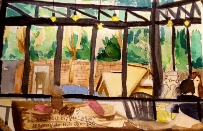 “ 하루하루가 다른몸. 허리통증. 엄마가 큰아이와 수업을 갔고 나는 밖에 앉아서 스케치를 한다. 민초 한잔 어쩌고 “