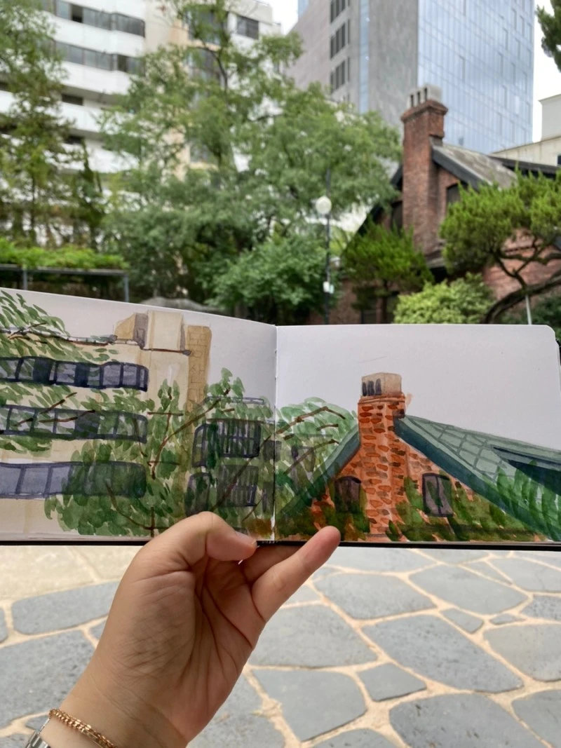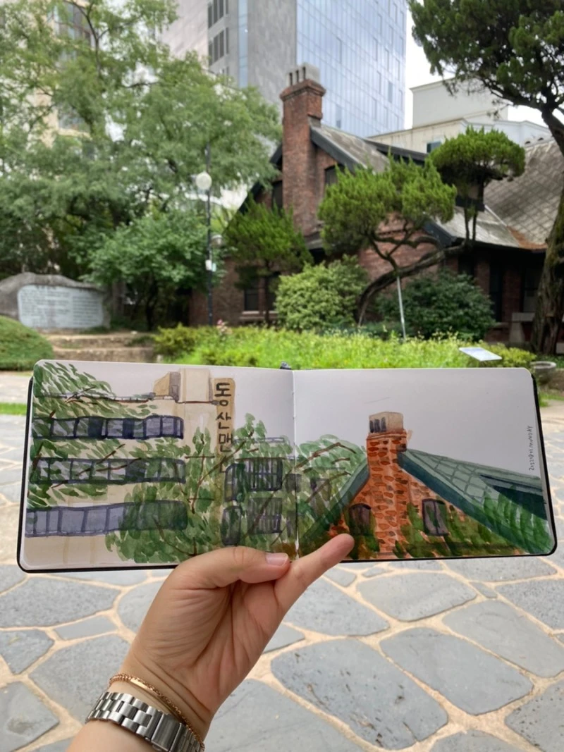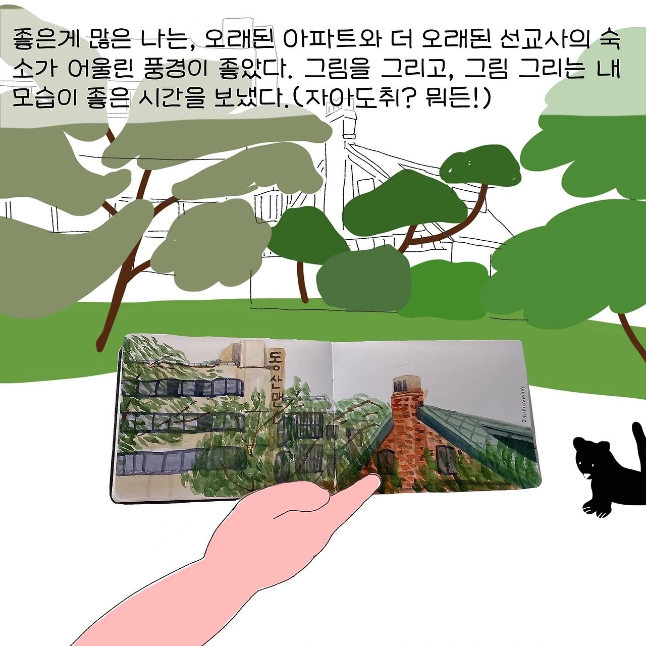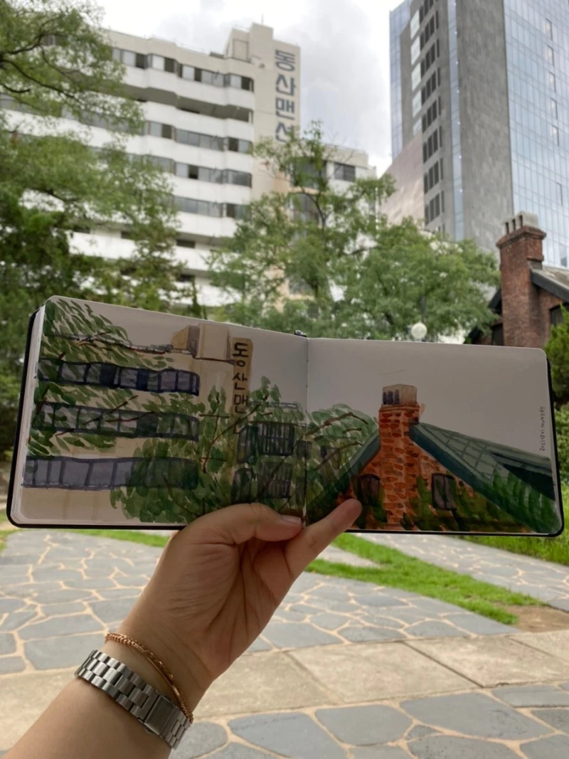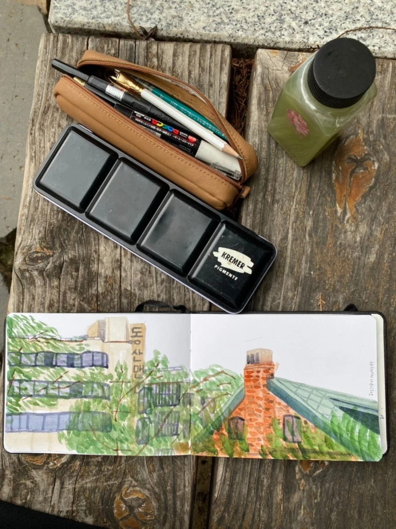 항상 그림을 염두한다. 그리던 못 그리던 가방에 싸들고 다니는 화구들. 어깨가 아파도 꼭 들고 다닌다. 그릴 수 있는데 아무것도 없어서 못 그리는 낭패가 더 싫다. 이번엔 스케치북이 빛났다! 그림을 완성한 줄 알았는데, [동산맨션]을 선명하게 해 주니 그림이 더 살아났다.