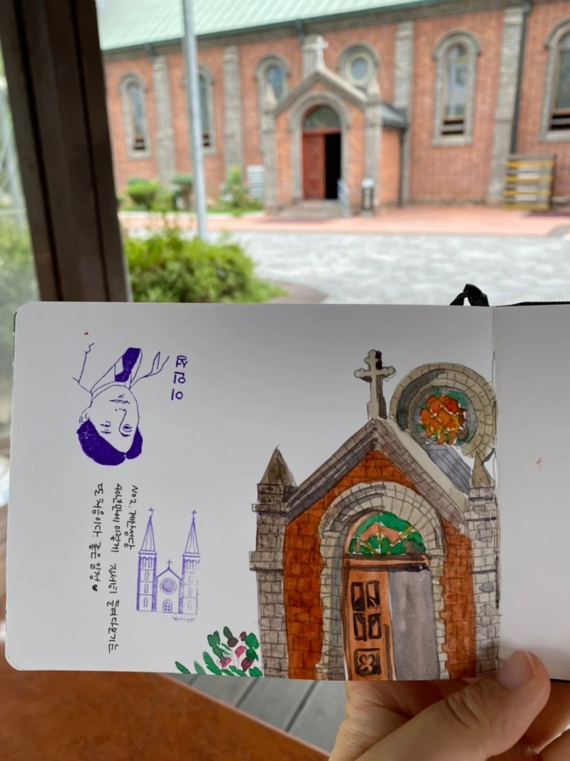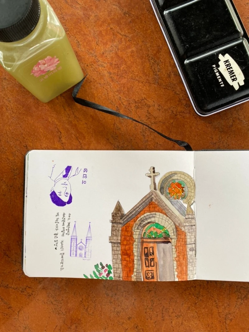 혼자 평양냉면 한 그릇을 먹었다. 그 집은 숟가락이 없었다. 역시 냉면 국물은 호로록 마셔야 제맛인가 보다. 그렇게 시원하게 한 그릇을 먹고 계산성당으로 걸었다. 습하고 더운 날, 어떤 성당을 담을 까 고심 끝에 작은 옆문을 그렸다. 너무 오래 파고 있을 수가 없어서다. 어쩌면 비가 쏟아질지도 몰랐다. 나는 우산도 가져오지 않았다.