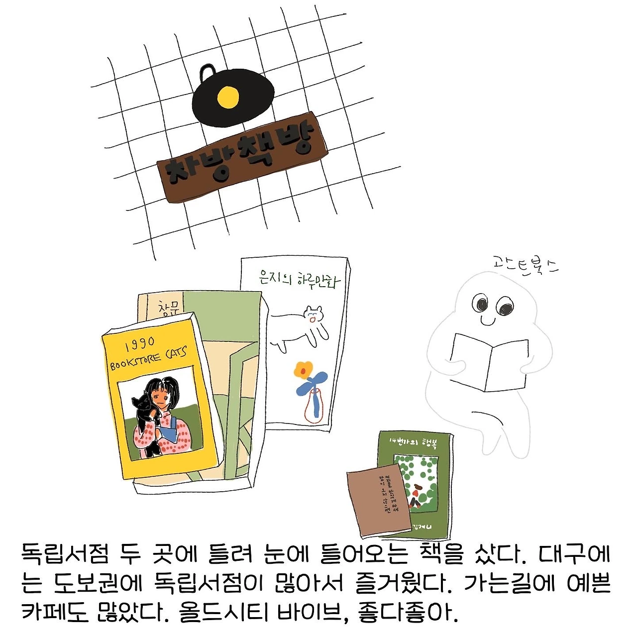 또 그 타령이다. 있다면 다행이지만, 없으면 지기가 곤란해질까? 그래서 참여라던지, 소개된 게 있나요를 추가한 질문이다. 1990 BOOKSTORE CATS. 고양이와 함께하는 서점들을 일러스트로 소개한 책에 차방책방이 나온다고 한다.