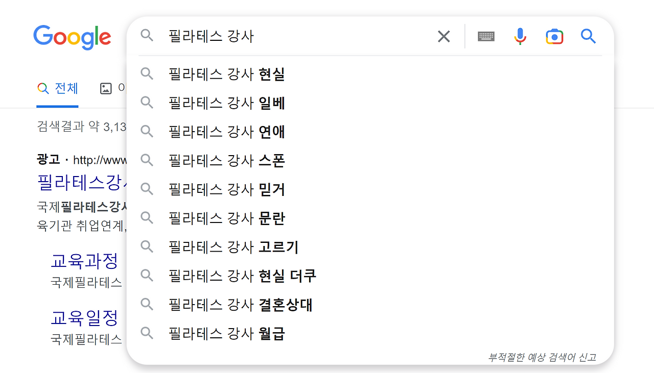 구글에 필라테스 강사를 치니까 아래처럼 연관 검색어가 나오더라고요.