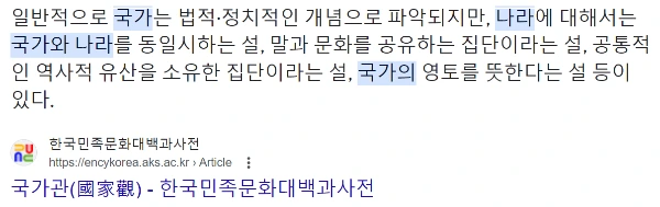 영국에 7년간 살며 가본 곳 중 가장 기억에 남고 마음에 들었던 곳은 아이러니하게도 몇 주 전에 다녀온 Snowdonia (스노우도니아) 국립공원입니다. 영국을 이루는 4개의 나라 중 하나인 웨일즈. 그 웨일즈에서 자연이 가장 아름답기로 유명하고 또 가장 높은 산이 있는 곳이 바로 웨일즈의 북쪽에 자리한 스노우도니아 국립공원입니다. 스노우도니아 국립공원에 얘기하기 전에 사설로 웨일즈와 영국에 대해 얘기를 좀 해보자면, 우리가 알고 있는 영국은 조금 특이한 곳입니다. '영국'은 하나의 국가이지만 동시에 4개의 나라로 구성되어 있습니다. '국가'와 '나라'의 차이에 대해 검색하면 다음과 같이 나옵니다.