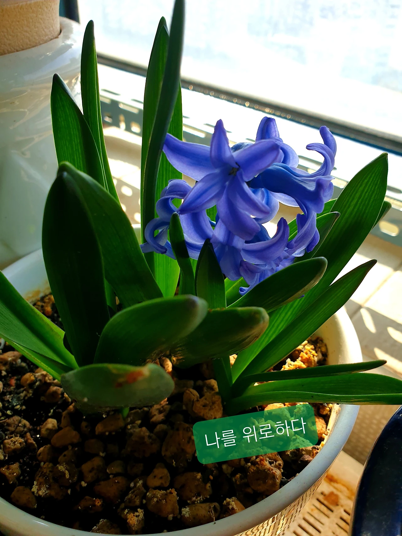 창가 화분에서 청보라 히야신스가