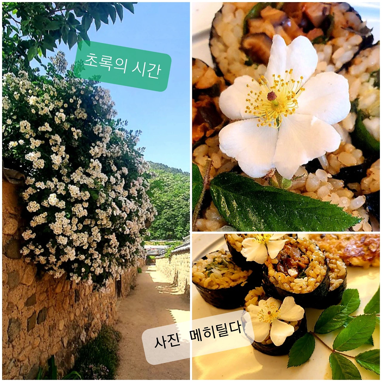 하얀 찔레꽃 한 송이 김밥 위에 얹으며