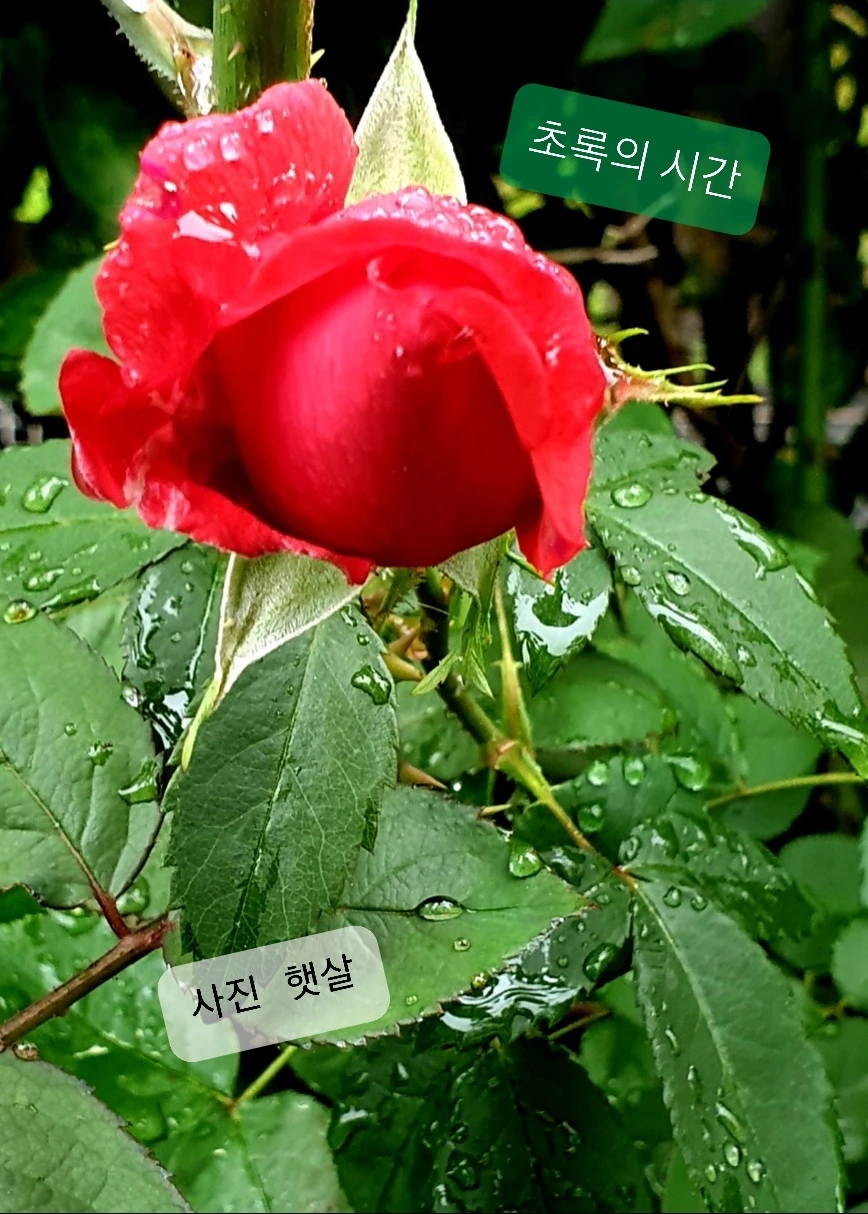 싱그러운 빗방울에 젖은 장미를 만났어요